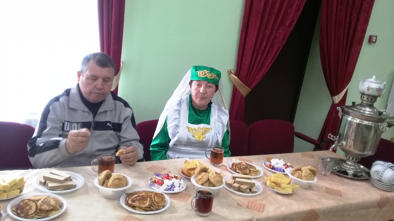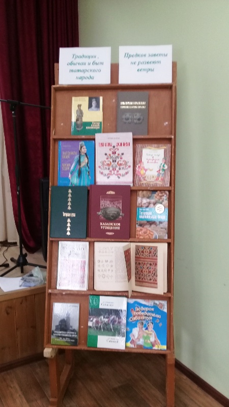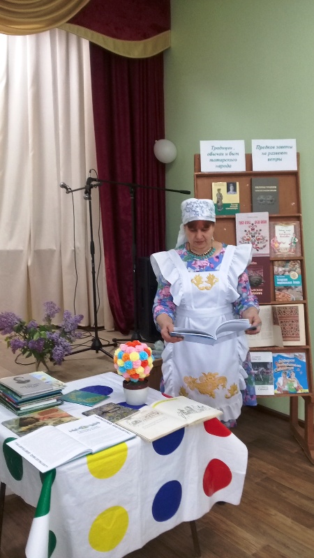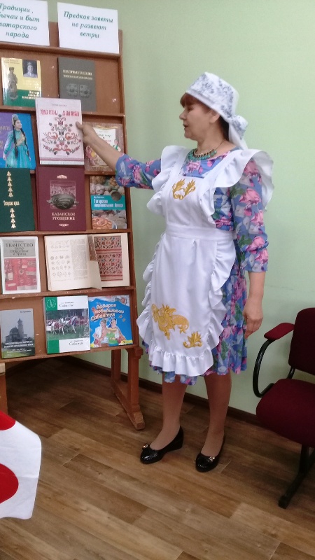 Шушы темага багышлап оештырылган китап күргәзмәсе белән таныштыра барып, китапханәче татар халкына гына хас бәйрәмнәр, милли киемнәр, милли ризыклар турында сөйләде. Күңел җылысы биреп әзерләнгән ризыклар куелган өстәл артында, күмер белән кайнатылган самавырдан ясалган чәй белән сыйлану бу чарага тагын да күркәмлек өстәде.