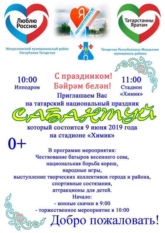 Хөрмәтле менделеевлылар сезне 2019 елның 9 июнендә « Химик» стадионында узачак татар милли бәйрәменә «Сабантуйга» чакырабыз. Чара программасында: язгы чәчү батырларын хөрмәтләү, милли көрәш, халык уеннары, шәһәр һәм районның иҗат коллективлары чыгышы, спорт ярышлары, балалар өчен аттракционнар.