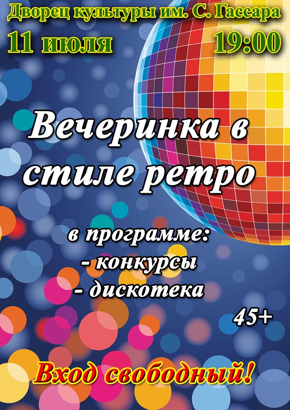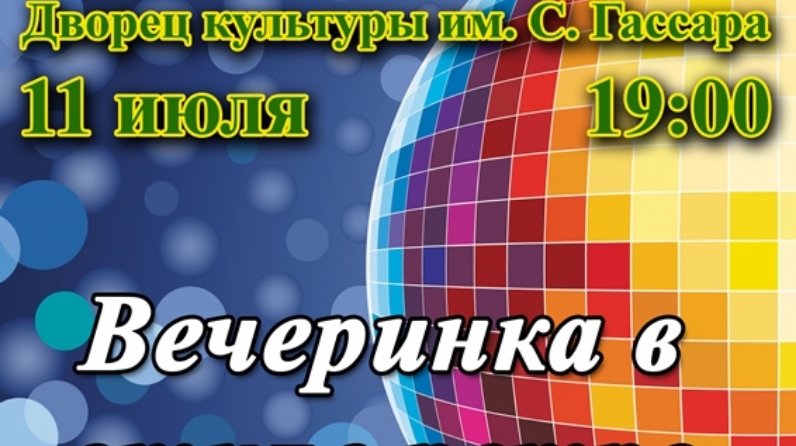С. Гассара ис. Мәдәният Сарае 11 июль көнне 19.00 сәгатьтә барлык теләүчеләрне ретро стилендә кичәгә чакыра. Программада конкурслар һәм дискотека. Керү ирекле.
