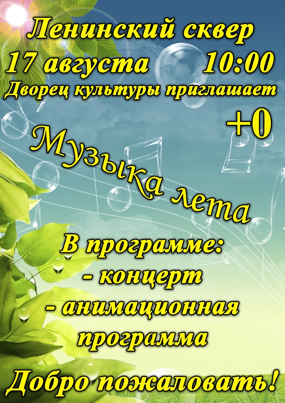 17 августта Ленин скверында 10.00 сәгатьтә "Җәй музыкасы" музыкаль-анимацион чара узачак. Программада: