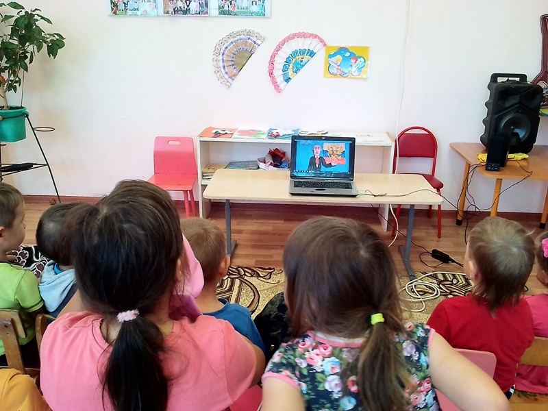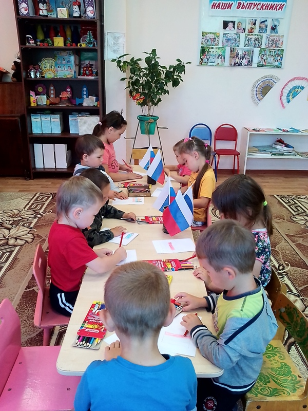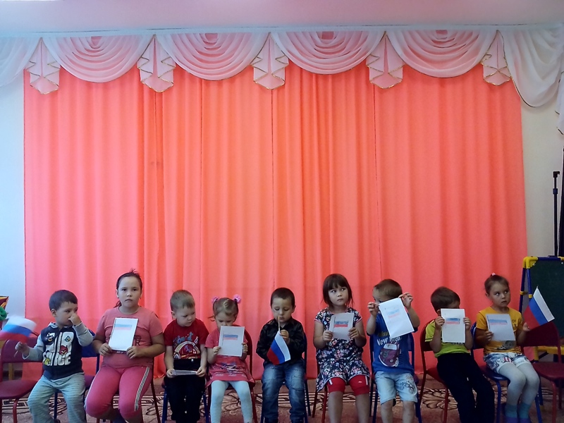 Балалар Россия флагының барлыкка килү тарихы белән таныштылар . Китапханәче белән бергә алар аның төсләрен, нинди учреждениеләр биналарында булырга тиешлеген искә төшерделәр. Балаларга безнең дәүләт символикасы турында «Россия флагы»исемле мультфильм күрсәтелде.