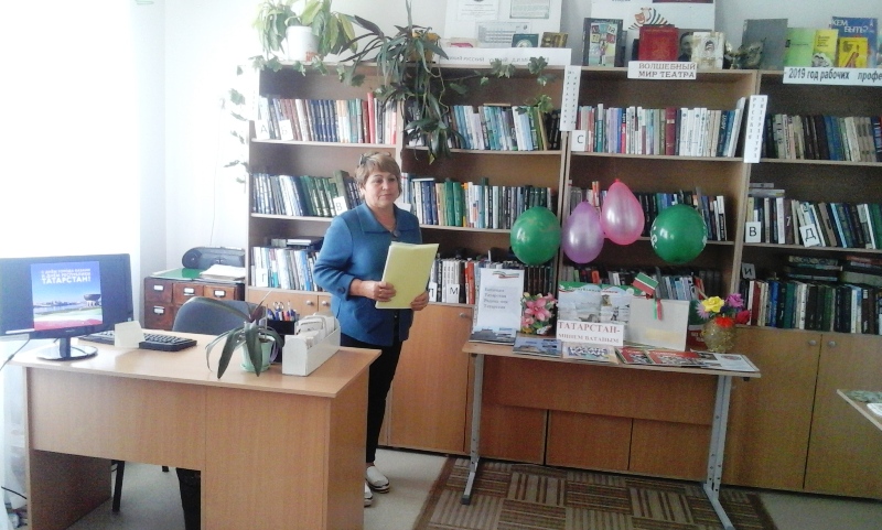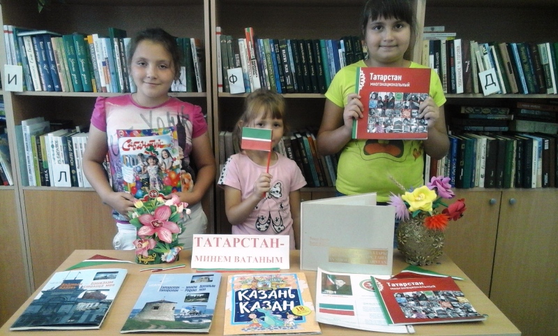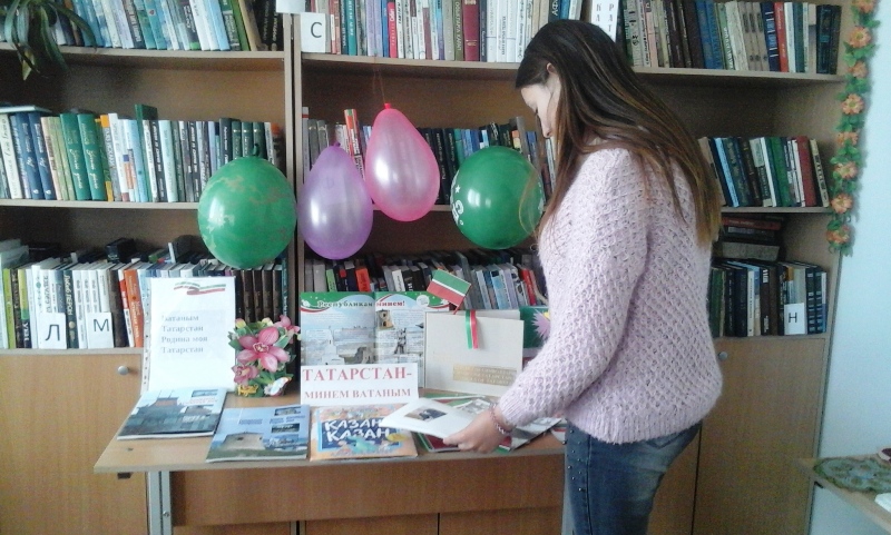 Чарага «Татарстан–минем Ватаным» дигэн китап кургәзмәсе оештырылган иде, укучылар андагы китаплар белән таныштылар. Китапханәче Данилова Е.И. Татарстан Республикасынын символлары турында, Республикабызда нинди генә милләт халкы яшәсә дэ тату,матур итеп гомер кичеруләрен сөйлэп утте, Татарстан гимны тынланды. Укучылар бик теләп «Минем республикам» исемле презентация карадылар. Соныннан барлык катнашучыларга да шарлар буләк ителде.