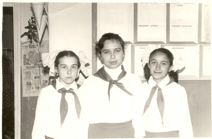 Фотографиядә Менделеевск 1 нче урта мәктәбенең пионерлар оешмасы (1980 нче еллар): Талыпова Әлфия Алмаз кызы, Лариса Иштанова (сулдан), Людмила Матвеева теркәлгән.