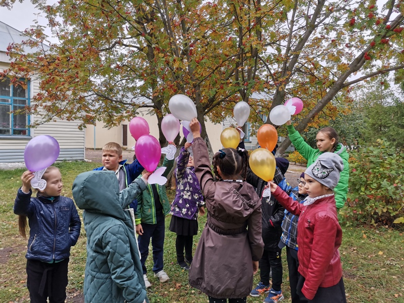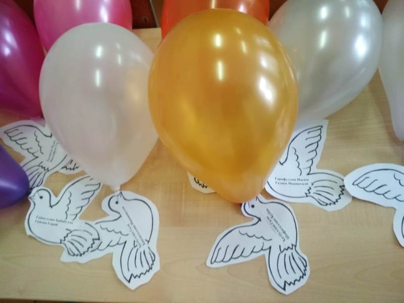 Иң элек укытучылар Р.Вахитова һәм Г.Нуретдинова балалар белән Тынычлык символы - ак күгәрченнәр ясадылар, аларга Бөек Ватан сугышында һәлак булган авылдашларыбызның исемнәрен язып беркеттеләр. Китапханәче Ф.Башарова Тынычлык көне тарихы турында сөйләп үтте, шул темага караган китаплар белән таныштырды. Ә аннары барысы бергә илебез тыныч, көннәребез якты, тормышыбыз матур булсын, Тынычлык хакына башын салган бабаларыбыз рухы шат булсын дигән теләкләр белән төсле шарларга беркетелгән ак күгәрченнәрне зәңгәр күккә очырдылар.