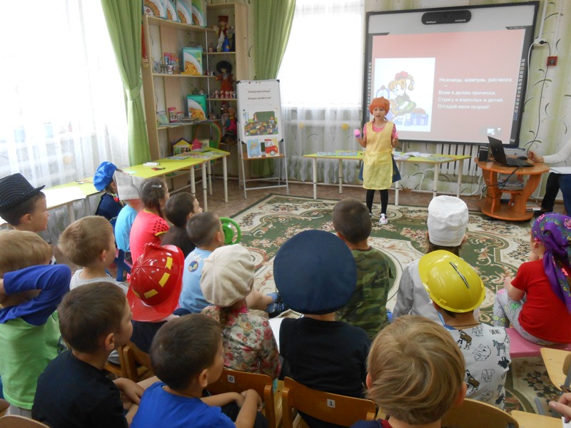 Чарада әзерлек төркемнәренә йөрүче балалар (тәрбиячеләр О.В. Лашманова һәм А.А. Семенова) катнашты. Китапханәче “Һөнәр” сүзенең мәгънәсен аңлатты, китаплар һәм журналлар белән таныштырды. "Төрле һөнәрләр", "Нәрсә артык," “Табылдык предметлар” уеннары аша балалар төрле хезмәт төрләре турында якынрак белделәр. Балалар үзләре дә төрле һөнәр вәкилләре кебек киенделәр, шигырьләр укыдылар. Чара ахырында "Барлык һөнәрләр дә кирәк, барлык һөнәрләр дә мөһим" дигән мультфильм каралды.