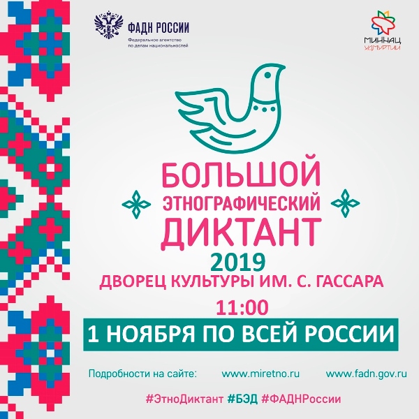 2019 елның 1 ноябрендә 11.00 сәгатьтә С. Гассар ис. Мәдәният сараенда Бөтенроссия Зур этнографик диктант узачак. Барлык теләүчеләрне чакырабыз. Керү ирекле.