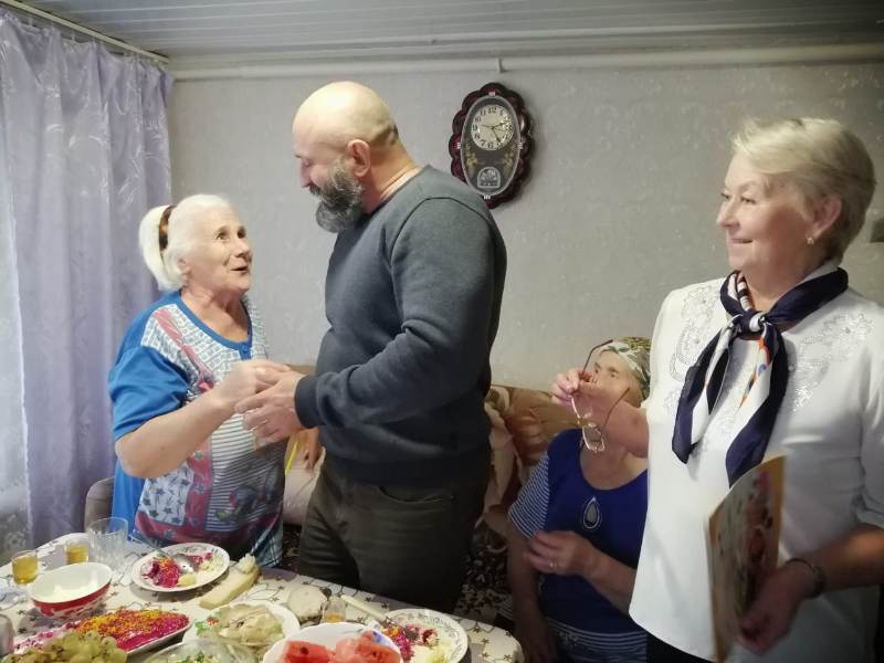 Тихоново авылы китапханәчесе Медведева Надежда Степановна авыл җирлеге башлыгы Карманов Алексей Михайлович белән бергә Александра Дмитриевнаның өендә булдылар, юбилее белән котладылар һәм бүләк тапшырдылар.