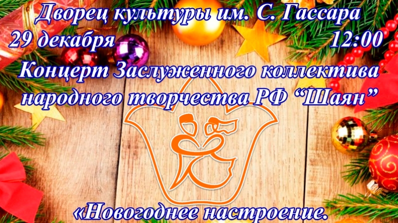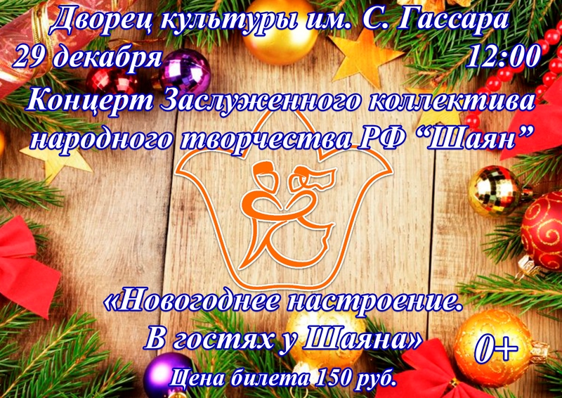 29 декабрь көнне 12.00 сәгатьтә С. Гассара ис. мәдәният сараенда РФ халык иҗатының атказанган «Шаян» коллективының Яңа ел концерты була. Билет бәясе 150 сум. Барлык теләүчеләрне көтеп калабыз.