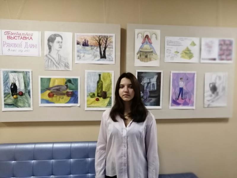 Балалар сәнгать мәктәбенең 2 нче катында рәсем сәнгате бүлегенең 3 нче сыйныф укучысы Рябова Дарьяның шәхси күргәзмәсе ачылды. Кызчык якты сәләтләре, җаваплылыгы һәм мәрхәмәтле булуы белән аерылып тора. Күргәзмәдә аның композицияләр, рәсемнәр, рәсем һәм дизайн буенча эшләре тәкъдим ителгән. Аның барлык эшләре дә үзенчәлекле колорит, детальләргә һәм үз техникасы белән аерылып тора. Даша ел дәвамында Отличник һәм төрле конкурсларда актив катнашкан.