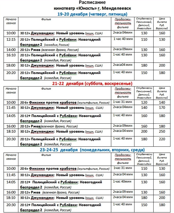 «Юность» кинотеатрында кинофильмнарның 19-25 декабрьдә язылышы