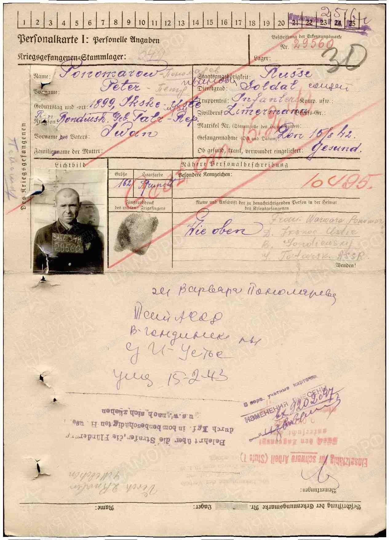 Пономарев Петр Иванович 1899 елда Татарстан АССРның Бондюг районы Ык Тамагында туа. Бондюг район хәрби комиссариаты мобилизацияләнә, 53 укчы полкында рядовой, 47 укчы дивизиясе сафларында хезмәт итә. Хәрби әсирнең карточкасы буенча 1942 елның 15 августында Украинада 349 шталгында тоткарлана, аныңисемен 29560 лагерь номеры алмаштыра.