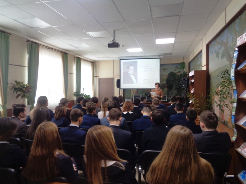 Үзәк китапханә хезмәткәрләре 1 нче мәктәпнең 9 сыйныф укучылары өчен А.С.Грибоедовның тууына 225 ел тулу уңаеннан “Грибоедовский бал” әдәби уены үткәрделәр.А. С. Грибоедов - әдәбиятчы, дипломат, драматург, шагыйрь, тәрҗемәче, музыкант, композитор. Аның атаклы "Горе от ума" комедиясе авторның үлемен дә, вакыт үзе дә кичерде. Пьесаның һәр фразасы - афоризм. Һәр герой - уртаклык юнәлеше.Балалар пьеса геройларын җөмләләр буенча таныдылар, афоризмнарны тәмамладылар, Грибоедовның кайсы замандашының комедия герое турында теге яки бу сүзләр булуын билгеләргә тырыштылар. Чарада 1977 һәм 1998 елгы спектакльләрдән фрагментлар күрсәтелде, "Грибоедов" документаль фильмыннан "Горе от ума" комедиясен язу турындагы фрагмент, "Мин сезнең янга килдем", "Россиядә ничек упоительный в в вечера" романслары һәм Грибоедовның вальсы яңгырады.