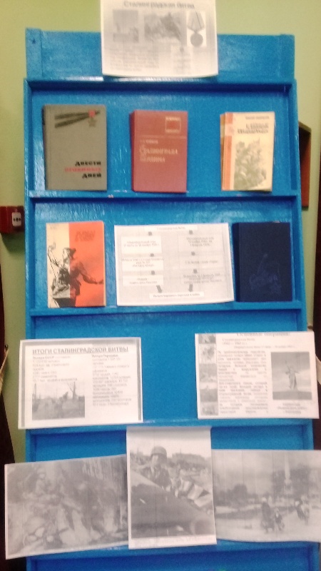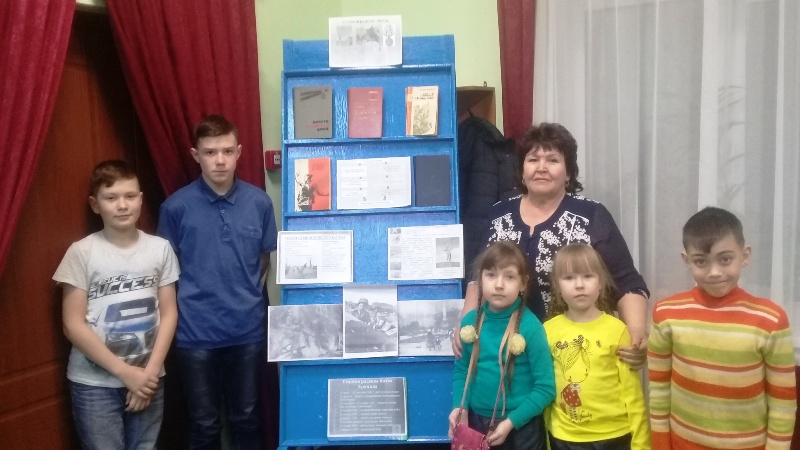 Китапханәче бу тарихи вакыйга турында сөйләде, күргәзмәгә куелган китаплар белән таныштырды. Виктор Некрасовның “Сталинград окопларында” дигән китабыннан шул сугыш китергән югалтулар, сугышчыларның батырлыгы сурәтләнгән өзеген, һәм “Аларның исемнәре һәм батырлыгы онытылмады” дигән китаптан “Сталинград балалары” хикәясен укыдылар. Китапханәче, укылганнар буенча нәтиҗә ясап, балаларны корбаннар бәрабәренә яулап алынган тынычлыкның кадерен белергә, җиңүне яулаганда вафат булганнарны зур хөрмәт белән искә алырга, ветераннарга, сугыш чоры балаларына карата ихтирамлы булырга чакырды.