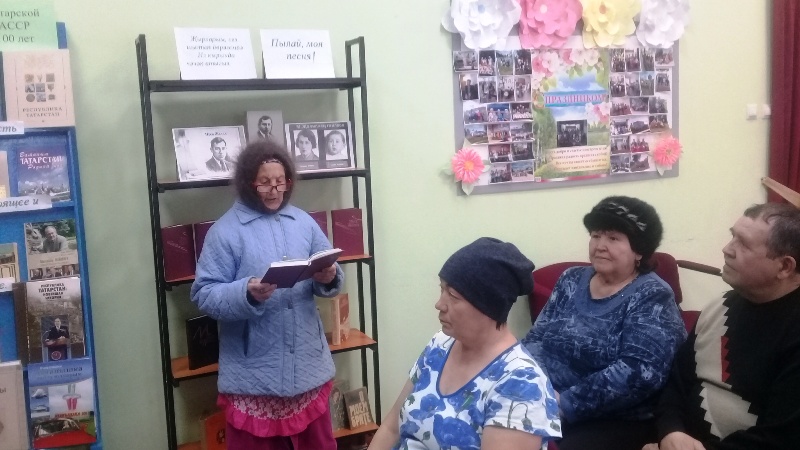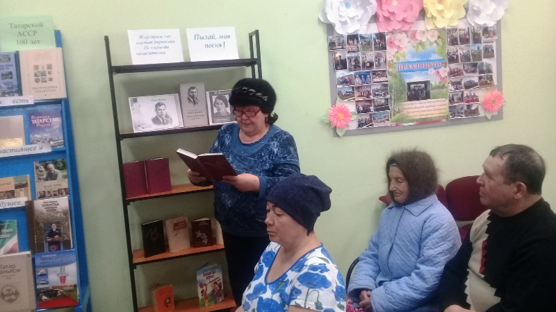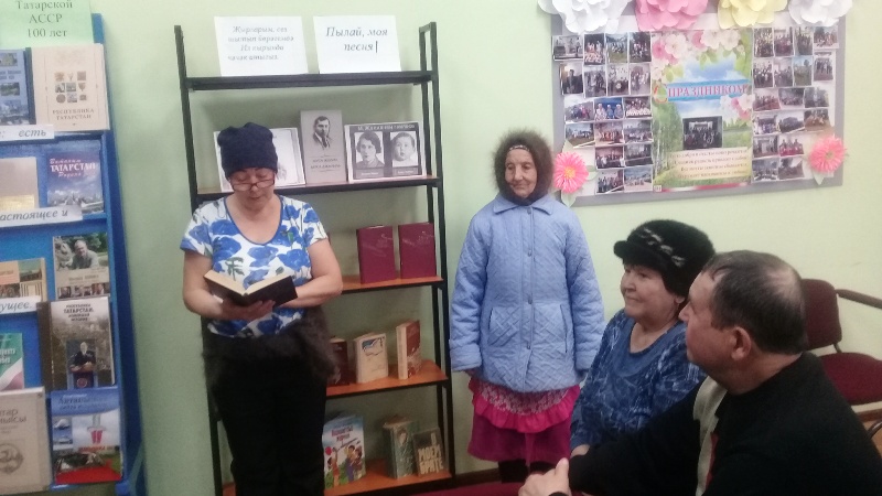 Китапханәгә килүчеләр китап күргәзмәсе белән танышып шагыйрьнең шигырьләрен дә укыдылар. Тазова Рәзилә Муса Җәлилнең кайбер шигырләрен яттан да сөйләде һәм өйгә укырга да алды.