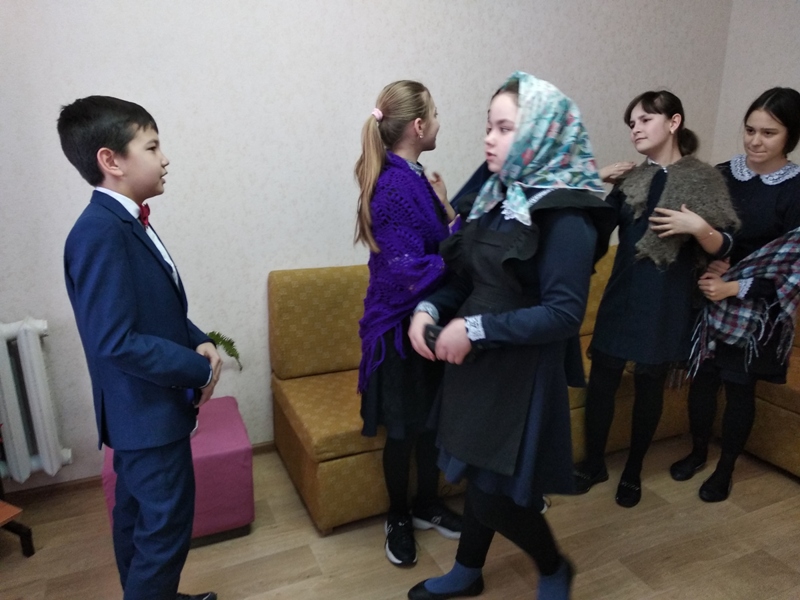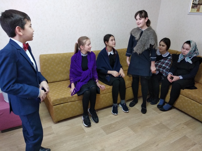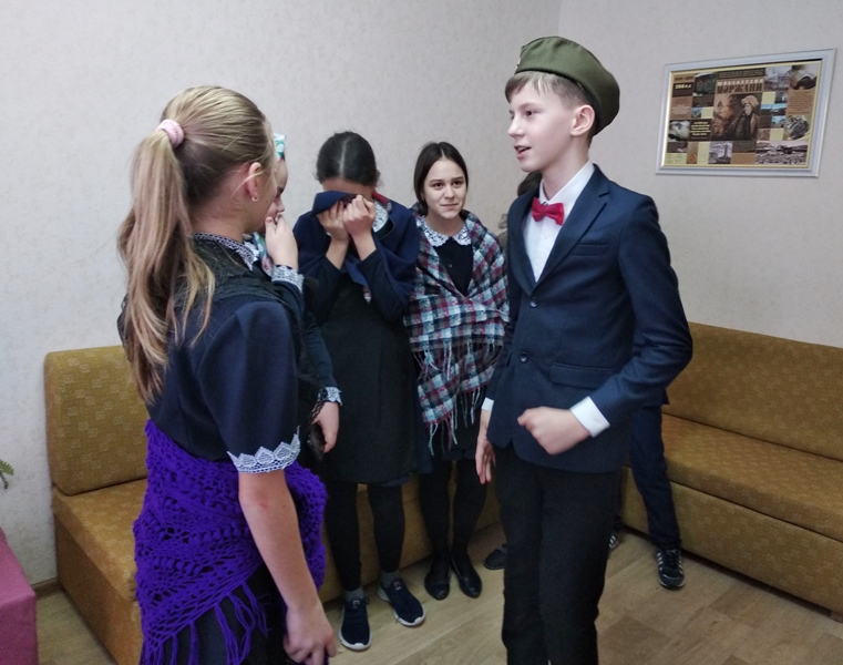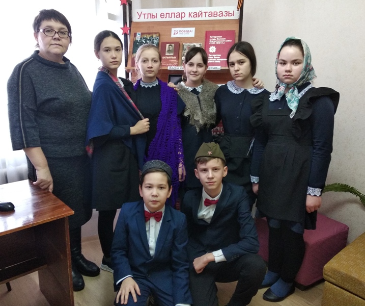 Китапханәче Хафизова Г.Р. балаларны Бөек Ватан сугышы чоры фольклор әсәрләре белән таныштырды. Бергәләп дүртьюллык шигырьләр, “Безне Герман аерды” бәете, “Хикмәтле гимнастика” мәзәге укылды. Укучылар сугышка озату- каршы алу күренешләренсәхнәләштереп күрсәттеләр. Кичә ахырында, балалар күргәзмәдәге китаплар белән танышып, уку өчен басмалар да сайладылар.