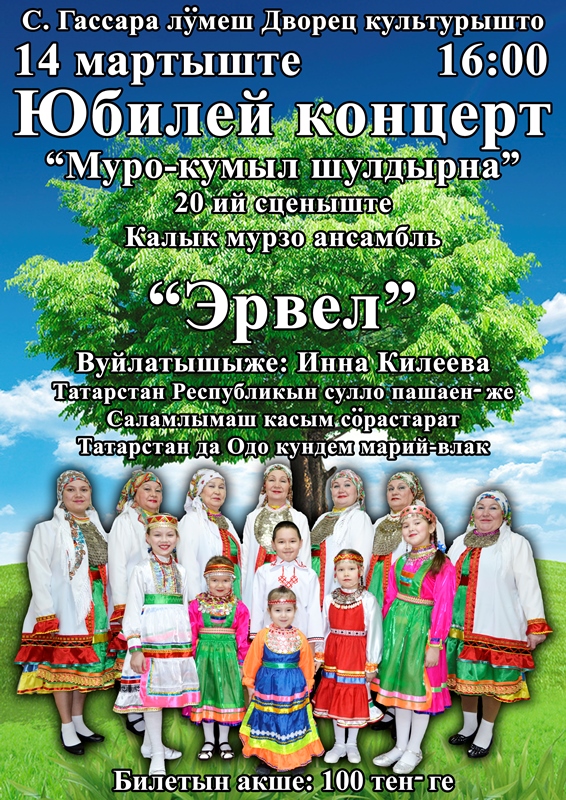 14 март 16.00 сәгатьтә С. Гассар ис. Мәдәният сараенда «Эрвел» мари җыры халык ансамбленең юбилей концерты була. Билет бәясе 100 сум. Барлык теләүчеләрне чакырабыз.