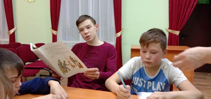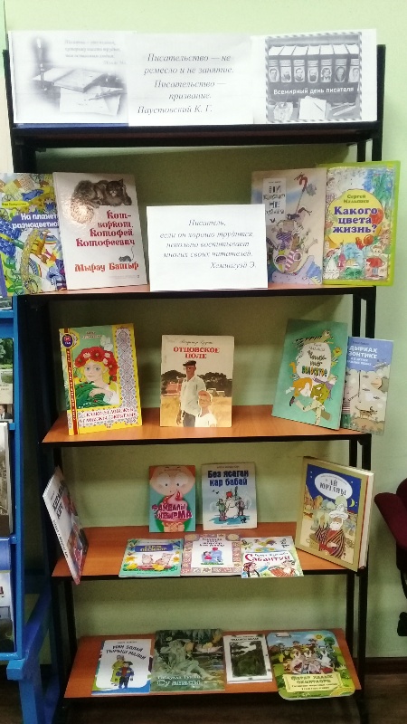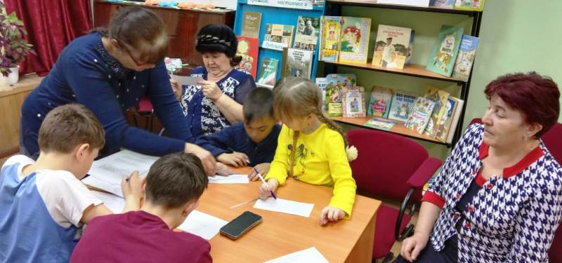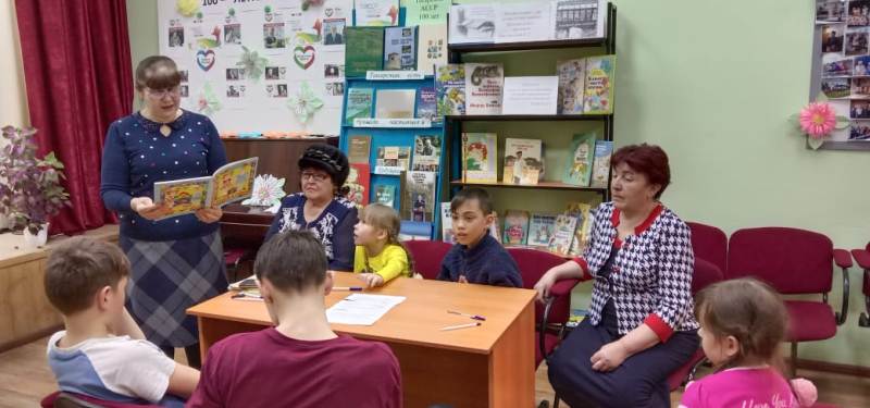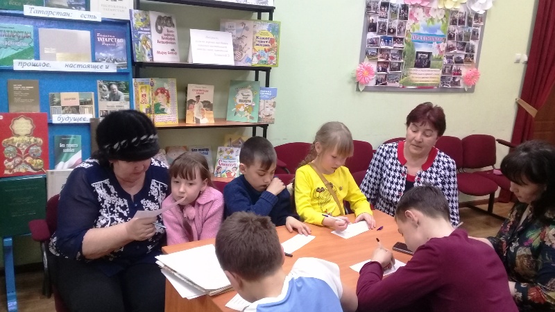 Китапханәче Сафина А.А.чарада катнашучылар белән язучылык эше турында сөйләште һәм әзерләнгән биремнәрне: уку һәм китап турында мәкальләр әйтү, С. Прокофьеваның ”Ялкау аяклар турында әкияте” буенча әзерләнгән буталган әкиятне тәртипкә китерү, Е. Чарушинның “Дәүләр һәм нәниләр” китабындагы иллюстрацияләр буенча хикәя төзү һәм китапта автор язган белән чагыштыру, шигырьнең ахырын уйлау биремнәрен үтәделәр. Шул уңайдан укылган әсәрнең тәрбияви әһәмияте турында сөйләштеләр һәм Лев Кузминның ”Яшәгән ди бер кыз”, Владимир Крупинның ”Әтием басуы” хикәяләр китабыннан “Икмәкне ташласаң, ул да сине ташлар” дигән хикәясен кычкырып укыдылар. Күргәзмәдән ике китапны укырга да алдылар.