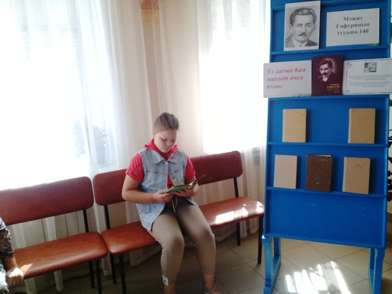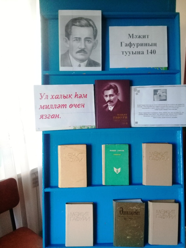 11 нче августта Тойгуҗа китапханәсе татар һәм башкорт әдәбиятларының классик язучысы – күренекле шагыйрь һәм драматург, публицист Мәҗит Гафуриныҗ тууына 140 ел тулу уңаеннан “Ул халык һәм милләт өчен язган” дигән китап күргәзмәсе оештырды.