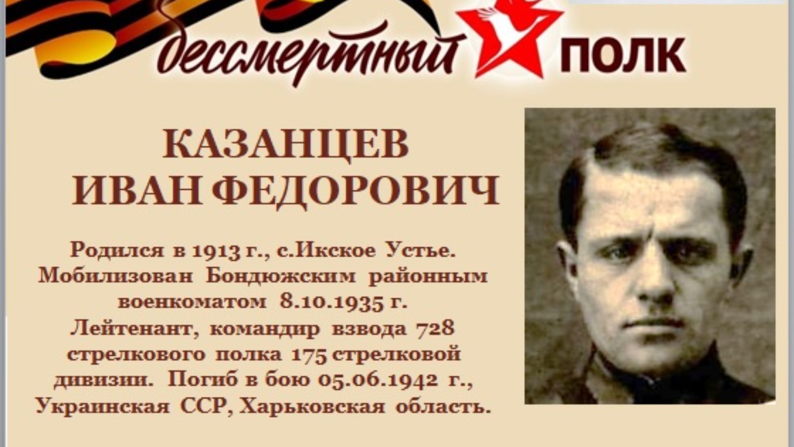 Бөек Җиңүнең 75 еллыгы елында Менделеевск шәһәренең туган якны өйрәнү музее Бондюг районында туган фронтовиклар турында мәкаләләр циклын дәвам итә. Бүген безнең Иван Казанцев турындагы хикәябез. Ул 1913 елда ТАССРның Бондюжск районы Икское Устье авылында, хәзерге вакытта ТР Менделеевск районында туган. Бондюг район хәрби комиссариаты тарафыннан Мобилизован. 8.10.1935 ел. Лейтенант, 175 нче укчы дивизиянең 728 нче укчы полкының взвод командиры. Хәтер китабында хәбәрсез югалган дип санала. «Мемориал» сайтында түбәндәге мәгълүматлар бар: һәлак булды 05.06.1942 ел, Украина ССР, Харьков өлк., Волчанский р-н, Арап-Плоское авылы, көньяк-көнбатышта. Казанцевның хатыны Александра Федоровна.