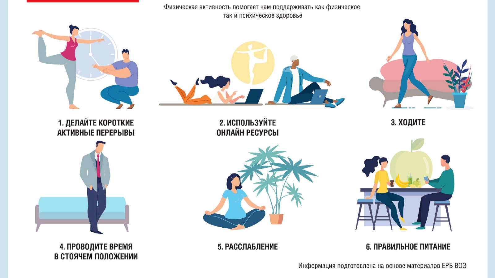 Физик активлык безгә физик һәм психик сәламәтлек тә ярдәм итә. Чөнки хәзерге вакытта күп кенә кешеләр мәҗбүр калырга өйдә аркасында COVID-19, ЕРБ ВОЗ эшләгән методик кулланма, анда кешеләргә тәкъдим ителә гади һәм куркынычсыз ысуллары саклап калу, физик активлыкны чикләнгән киңлек шартларында.