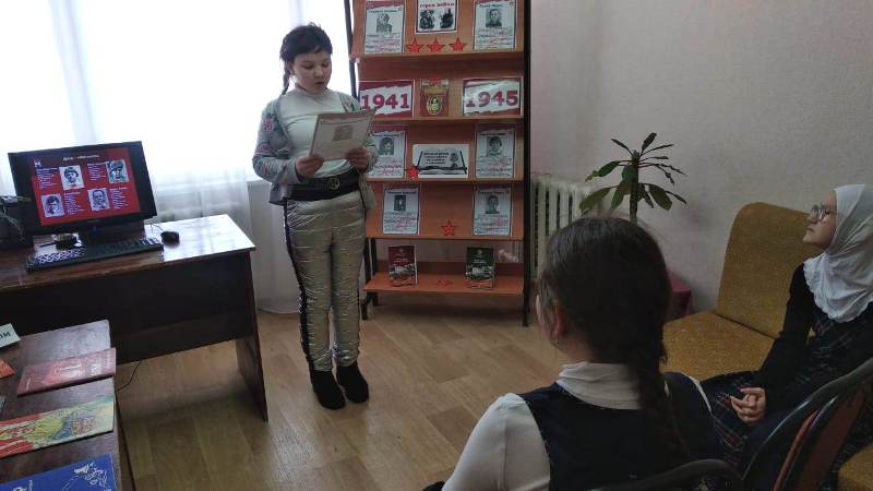 Татар китапханәсендә “Безне җиңүгә илткән юллар” дип исемләнгән батырлык дәресе узды. Китапханәче Хафизова Г.Р. Бөек Ватан сугышы вакытында, балалар һәм яшүсмерләрнең партизан хәрәкәтендә катнашуы турында сөйләде. Советлар Союзы Герое исеме бирелгән яшүсмерләр турында презентация күрсәтте.