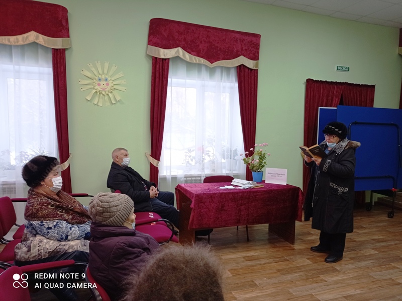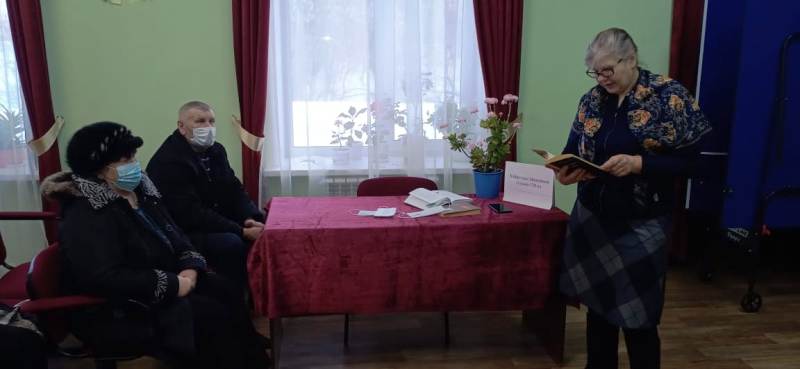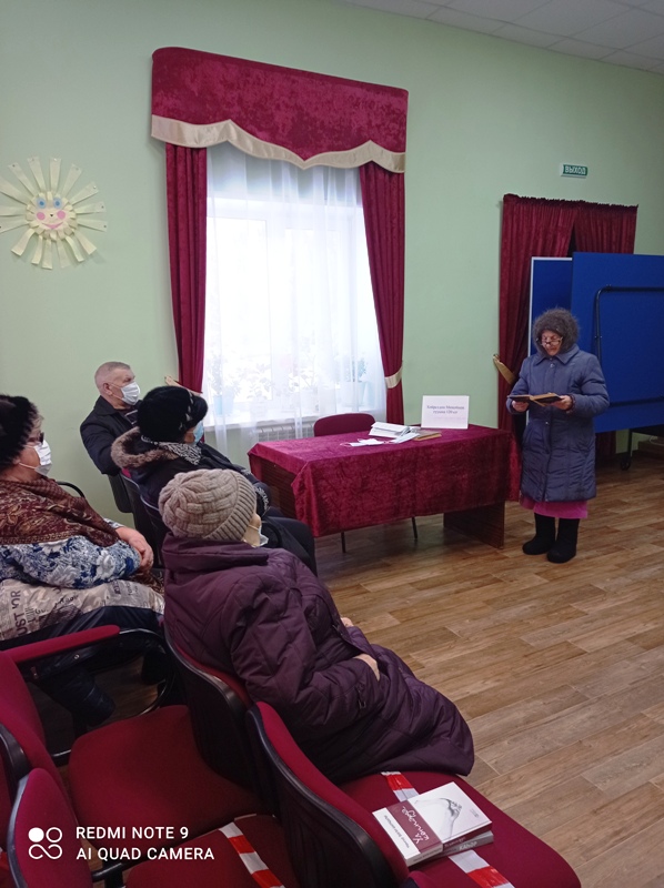 Китапханәче бу китапны төзүче үзе дә фронтовик, сугышчы, язучы Самат Шакир икәнен әйтте һәм Хәйретдин Мөҗәйнең тормыш юлы, иҗаты белән таныштырды. Китап укучылар “Утлы еллар поэзиясе” китабыннан язучының сугышка кадәр һәм сугыш эчендә язылган шигырьләрен, “Сугыш язмалары”ның иң әһәмиятле өлешләрен укыдылар.