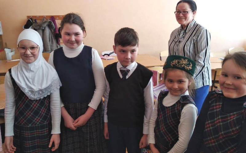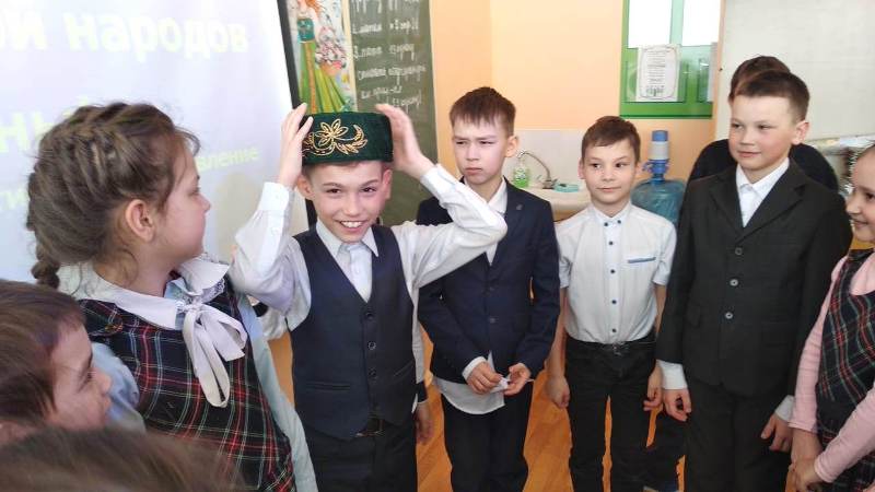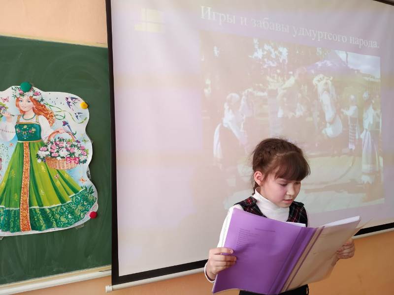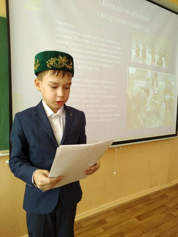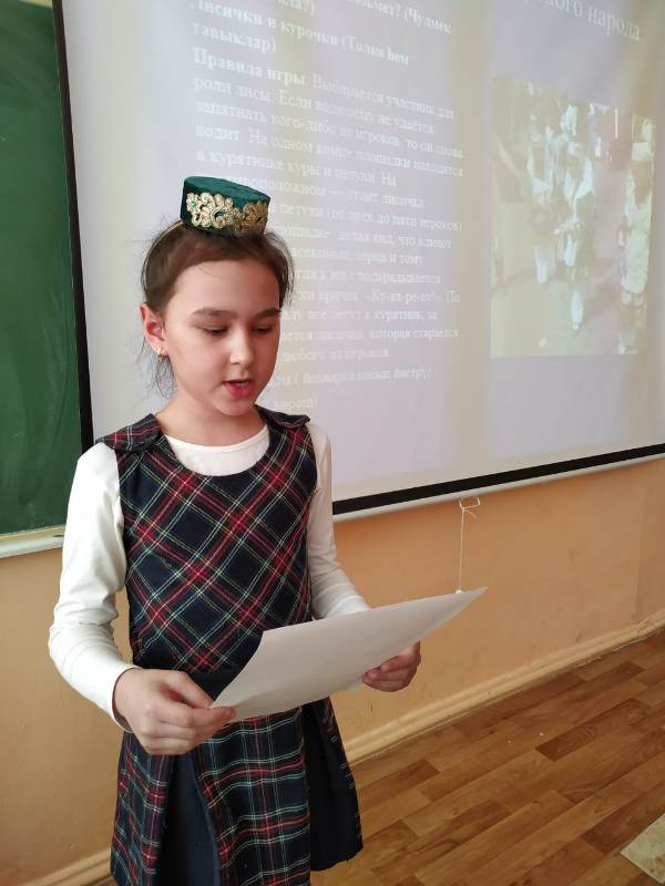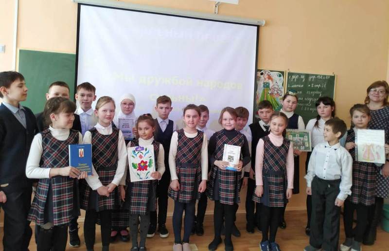 Укучылар, сыйныф җитәкчесе Г.Ф. Әминева җитәкчелендә, татар, рус, мари, удмурт, башкорт милләтләренең уен-йола, милли киемнәре-ризыклары турында эзләнеп, проект әзерләгәннәр. Алар шул турыда сөйләп таныштырдылар. Китапханәче Г.Р. Хафизова балаларга Татарстан Республикасында яшәүче халыклар турында китаплар, журналлар тәкъдим итте, “Түбәтәй” уенын уйнатты. Укучылар татар халык уены белән якыннан танышып, үзләренең төрле һөнәрләрен дә күрсәттеләр.
