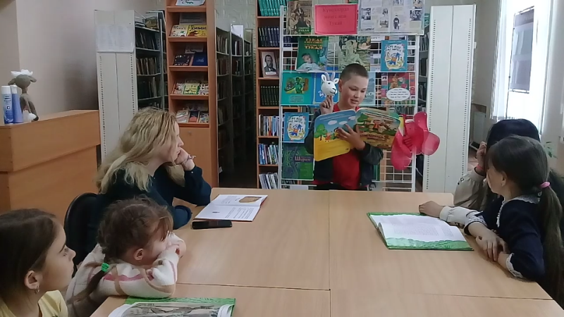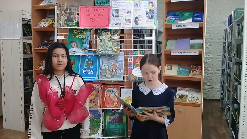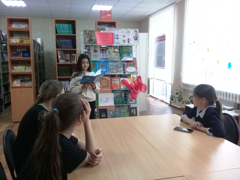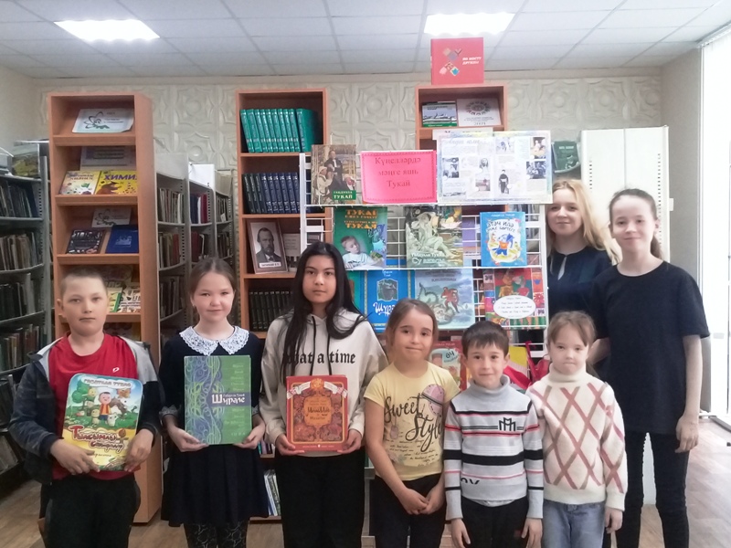 Китапханәче Рузалия Яраханова балаларны аның тормышы һәм иҗаты белән таныштырды. Аннан соң балалар "кечкенә Апушның" "Гали белән кәҗә", "Бала белән күбәләк", "Туган тел", "Иртә" дигән матур шигырьләрен кычкырып укыдылар. Китап күргәзмәсенә күзәтү ясалды.