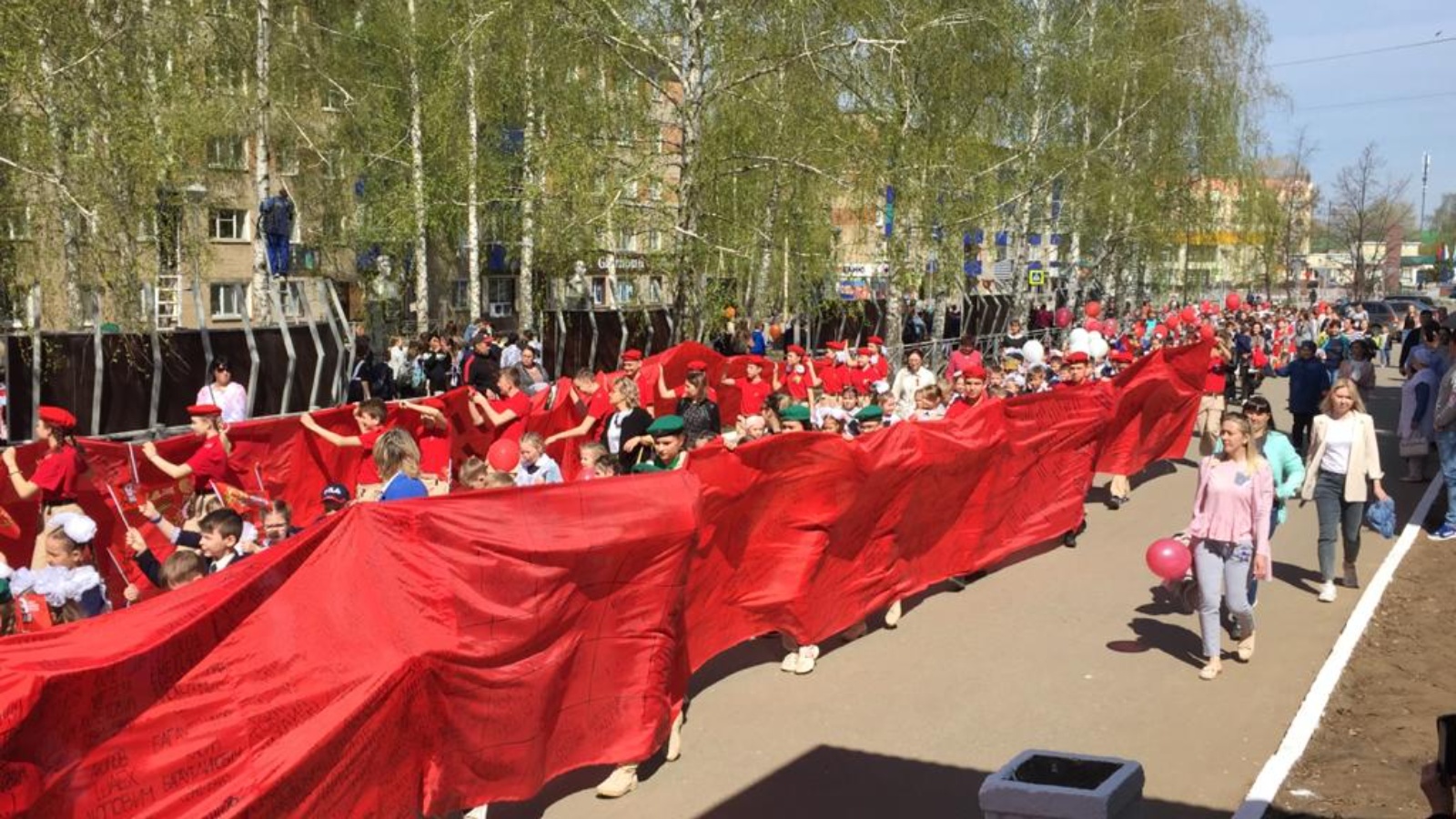 Мәктәп укучылары кызыл тукымада Бөек Ватан сугышында катнашкан бабаларының фамилияләрен яздылар. Мәктәп каршындагы мәйданда 84 метр озынлыгында тукыма суздылар. Митингта катнашучылар бу куркыныч сугышта һәлак булганнарның барысын да бер минутлык тынлык белән искә алдылар.
