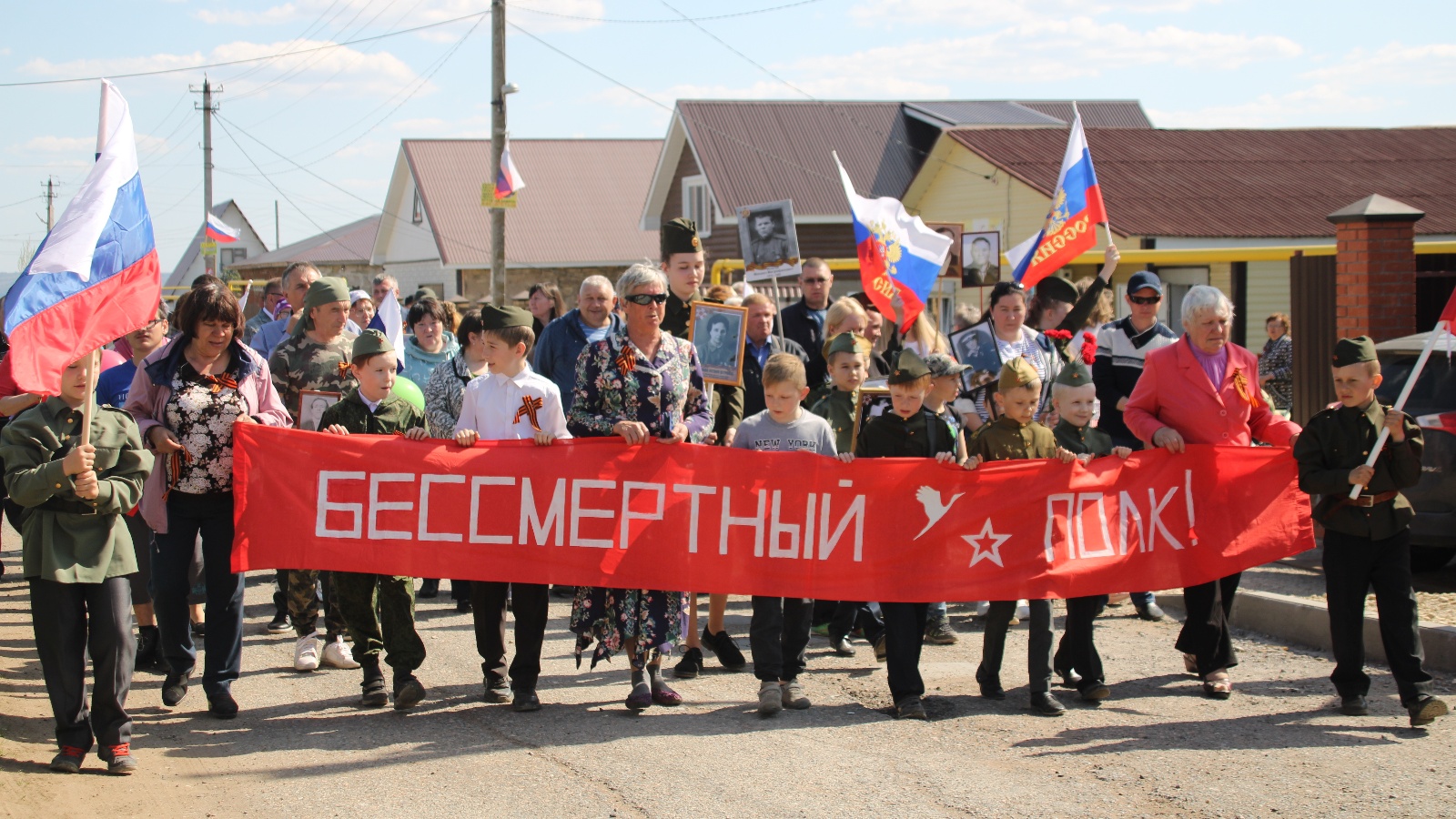 Өлкәннәр һәм балалар үзәк урам буйлап әтиләренең, бабаларының шушы дәһшәтле сугышта катнашкан портретлары, тыл хезмәтчәннәре белән үттеләр.