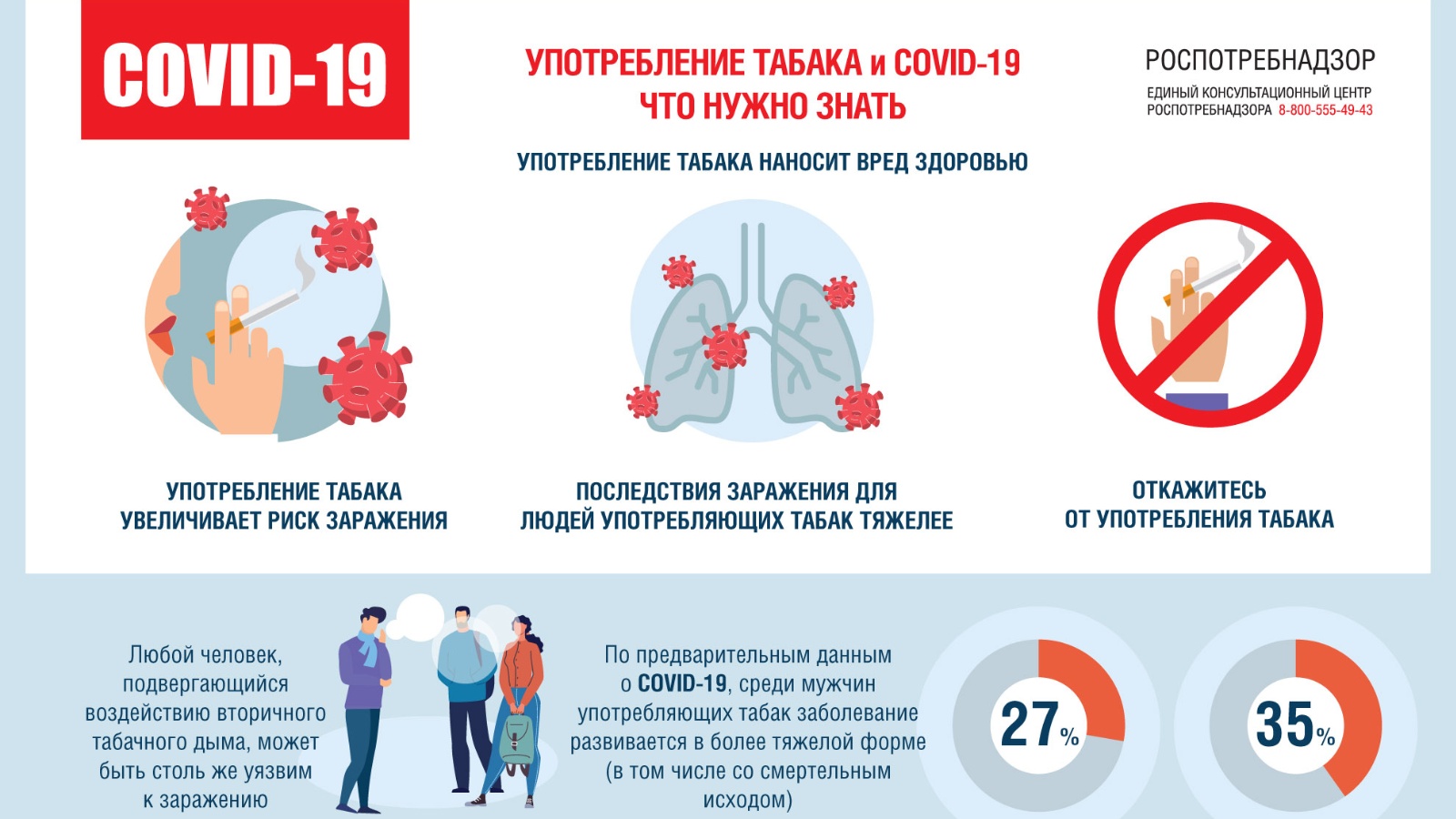 Бөтендөнья тәмәкесез көнне Кулланучылар хокукларын яклау һәм кеше иминлеге өлкәсендә күзәтчелек федераль хезмәте гамәлдәге мәгълүматларга караганда, тәмәке тартучыларның COVID-19 авыруы ешрак авыр формада уза, дип искәртә. Тәмәке тарту үпкәләрнең эшен начарайта, һәм тәмәке тартучы кешенең организмы яңа коронавирус китереп чыгара торган респиратор авыру белән көрәшү кыенрак.