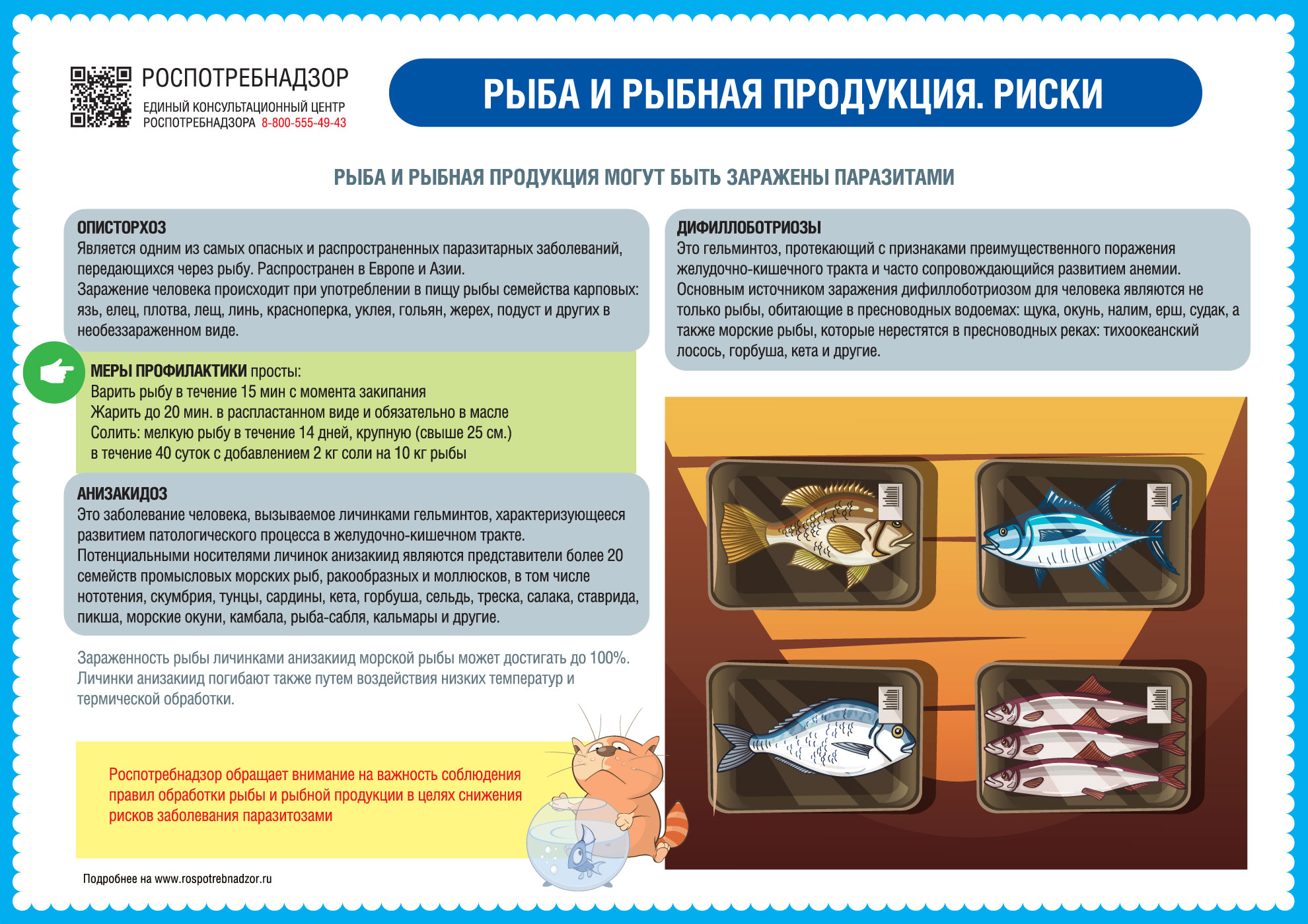 Кулланучылар хокукларын яклау һәм кеше иминлеге өлкәсендә күзәтчелек федераль хезмәте паразитозлар белән авыру куркынычын киметү максатларында балык һәм балык продукциясен эшкәртү кагыйдәләрен үтәүнең мөһимлегенә игътибар итә. Шуны истә тотарга кирәк, балык һәм балык продукциясе паразитлар белән зарарланырга мөмкин. Иң киң таралганнары-описторхоз, клонорхоз, дифиллоботриозлар, анизакидозлар.