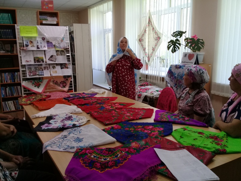 Китапханәче Рузалия Яраханова җыелган кунакларга хатын-кыз күрке булган – яулыклар тарихы турында сөйләде. Китапханәдә “Яулыкларда халык тарихы” дигән күргәзмә оештырылган иде. Элегерәк безнең әбиләр, әниләр башларына өрпәк (өчпочмаклы яулык) белән тастар (ак киндердән киселгән озынча яулык) бәйләп йөргәннәр. Ләкин яңа төр тукымалар барлыкка килү белән, фабрикада эшләнгән яулыклар киң таралган, ә өрпәк белән тастар кулланыштан төшеп калган. Дүртпочмаклы фабрика яулыгы хатын-кызларыбыз арасында киң таралган баш киеме булып китә. Татар хатын-кызлары аны үзебезнең милли гореф-гадәтләргә туры китереп бөркенә.
