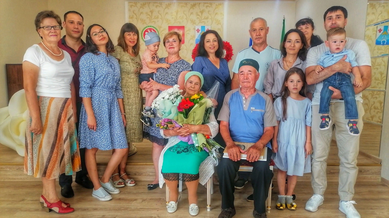 Көчле алкышлар һәм Мендельсон маршы астында ЗАГС Идарәсенең тантаналар залына бриллиант юбилярлар керде.