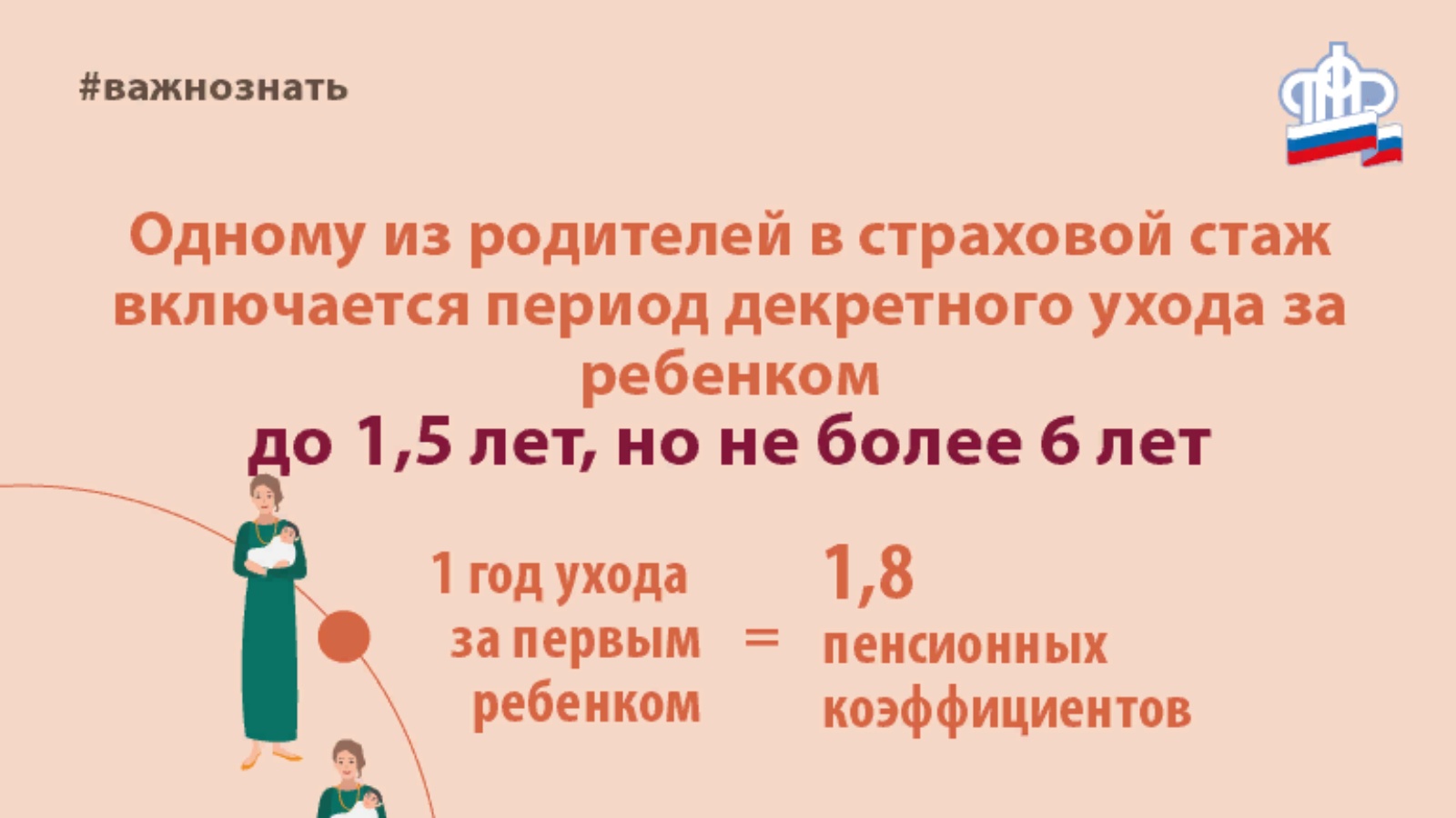 Баланы карау чорлары иминият стажына исәпләнә, әгәр алар элек тә, (яки) алар артыннан эш һәм (яки) башка эшчәнлек чорлары (дәвамлылыгына бәйсез рәвештә) узган булса, мәҗбүри пенсия иминиятенә иминият взнослары түләнгән. Бу ата-аналарга үзләренең пенсия хокукларын формалаштырырга һәм иминият пенсиясенә хокук алырга мөмкинлек бирә.