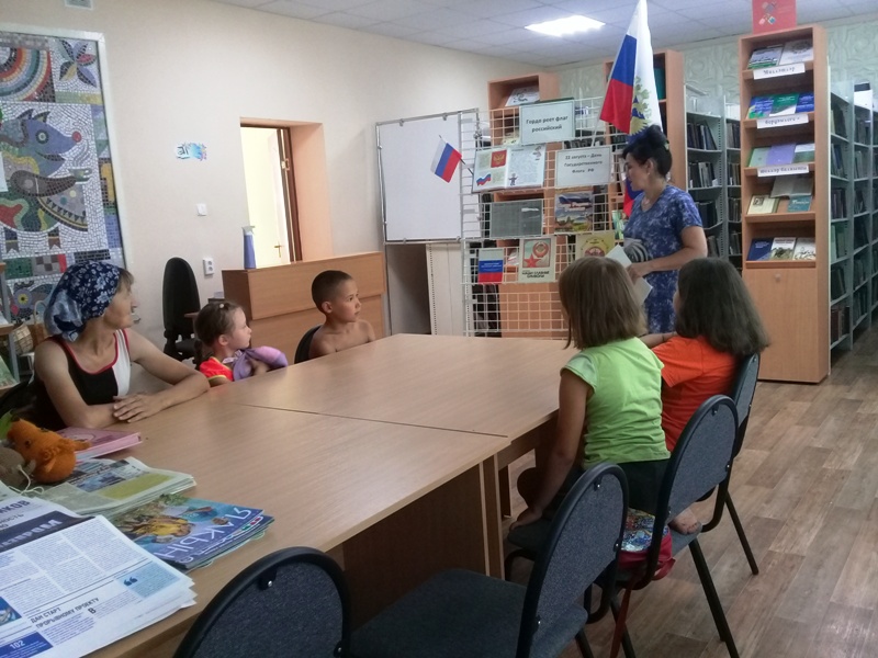 Китапханәче балаларны дәүләт флагы тарихы белән таныштырды, һәр төснең әһәмияте турында сөйләде. Балалар «Безнең триколор» викторинасы сорауларына актив җавап бирделәр, Туган ил турында мәкальләр һәм әйтемнәр искә төшерделәр, табышмаклар чиштеләр. Флешмобта катнаштылар. Чарага «Россия флагы горур җилферди» дигән китап күргәзмәсе оештырылды.