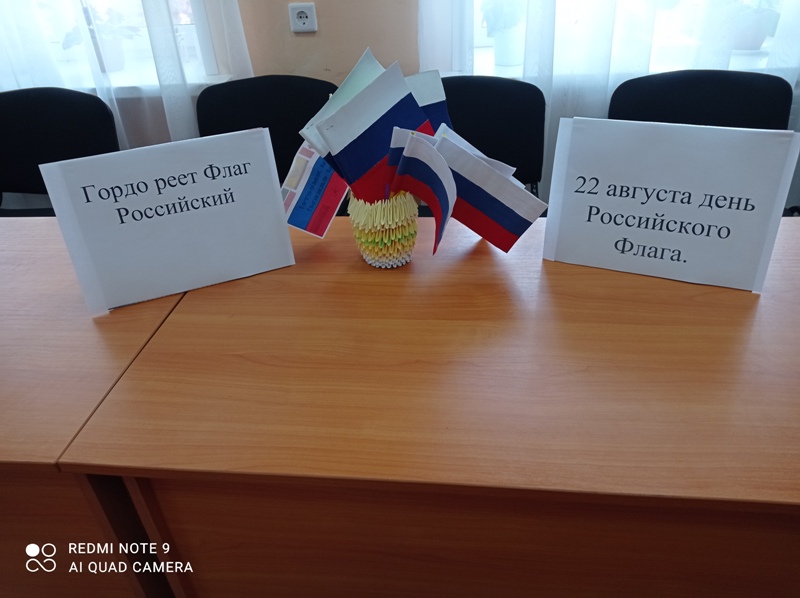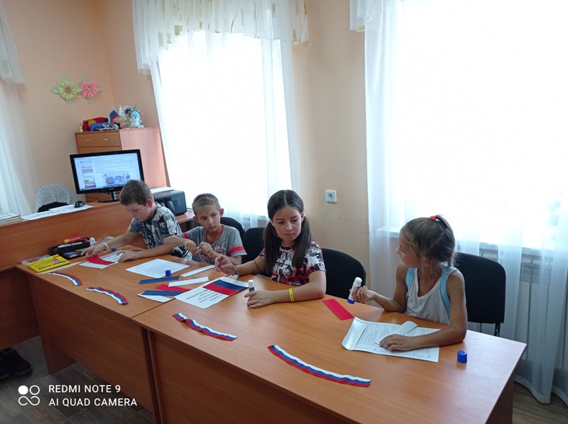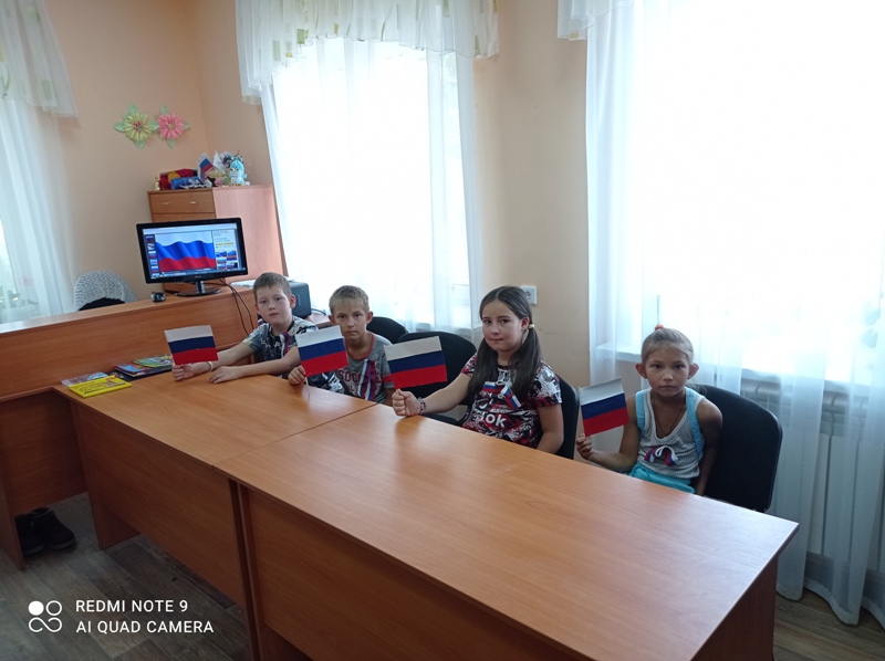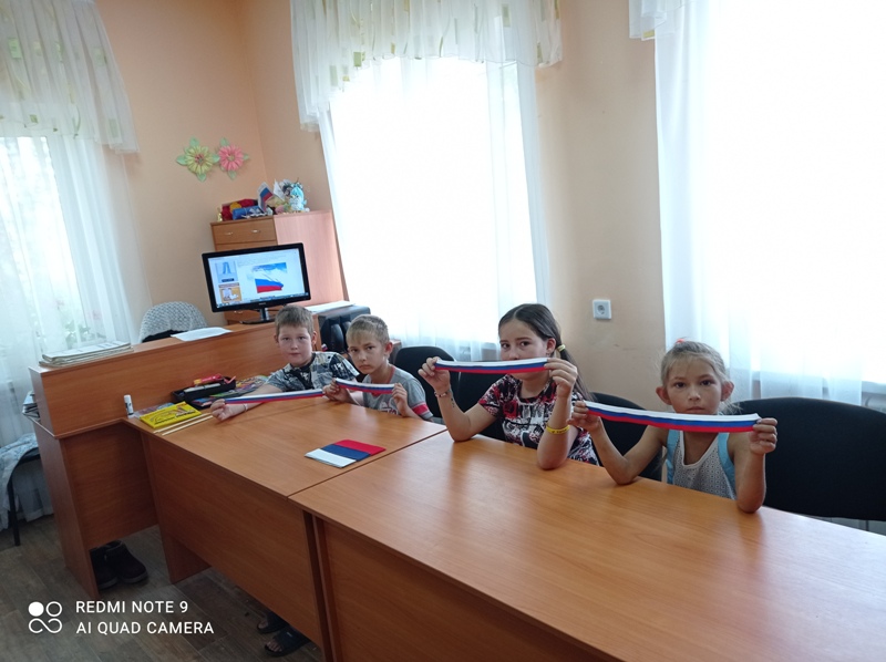 Китапханәче балаларга илебезнең әләменең тарихы, аның әһәмияте турында мәгълүмат бирде, аннан соң сөйләгәннәр буенча балалар сорауларга җаваплар бирделәр һәм үзләре дә кәгазьдән Россия әләмен ясадылар.