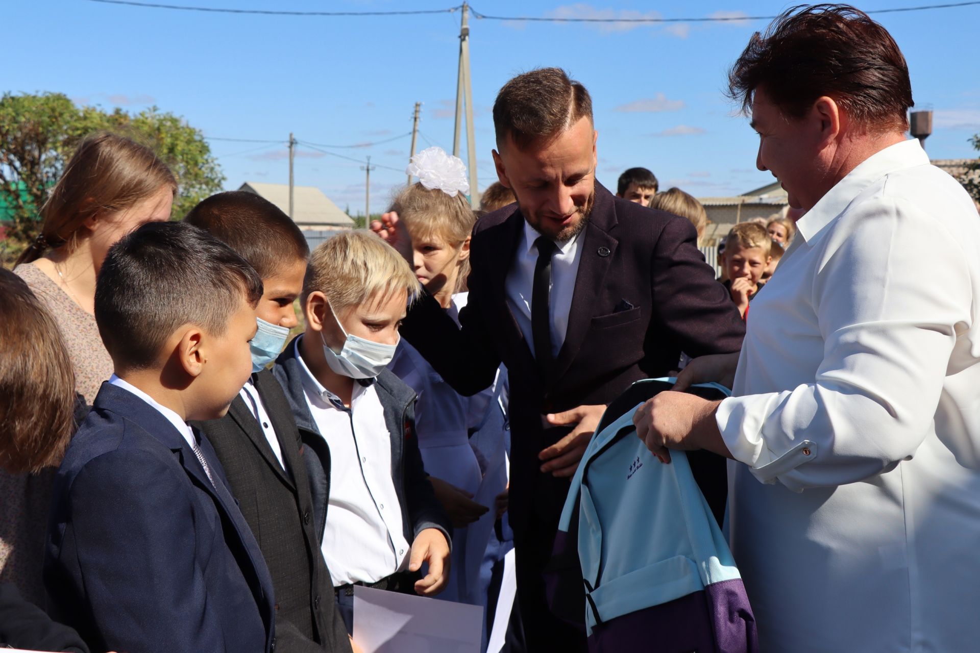 Сәламәтлек мөмкинлекләре чикләнгән мәктәп мәйданчыгына 1-7 сыйныф укучылары җыелды. Балаларны якынлашып килүче Белем көне белән мәгариф идарәсе җитәкчесе Илбәр Таһиров һәм мәктәп директоры Дамира Сәлимханова котладылар, аларга ныклы сәламәтлек һәм яхшы укуларын теләделәр.