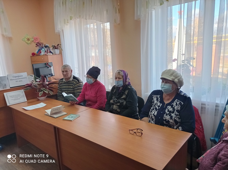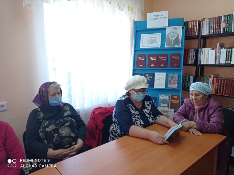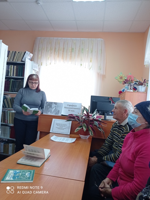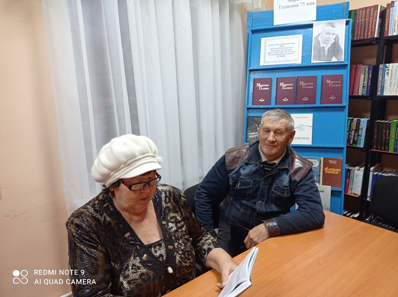 Китапханәче язучы, шагыйрьләрнең китапханәдәге китаплары белән таныштырды, тормышлары, иҗатлары турында сөйләде. Марсель Галиевнең соңгы тапкыр китапханәгә кайткан “Кәефеңә көя төшермә” исемле китабыннан кечкенә хикәяләрне, гыйбарәләрне кызыксынып укыдылар, Гарифҗан Мөхәммәтшинның төрле елларда нәшер ителгән шигырь китапларындагы шигырьләре шулай ук китап укучыларга ошады. Ике авторның да шигырьләре арасында җыр тексты буларак халыкка танылганнары: М. Галиевнең “Кайту”, “Су буеннан әнкәй кайтып килә”, Г. Мөхәммәтшинның “Хыял”, “Керим әле урманнарга” һәм башка җырларын бергәләп башкардылар.