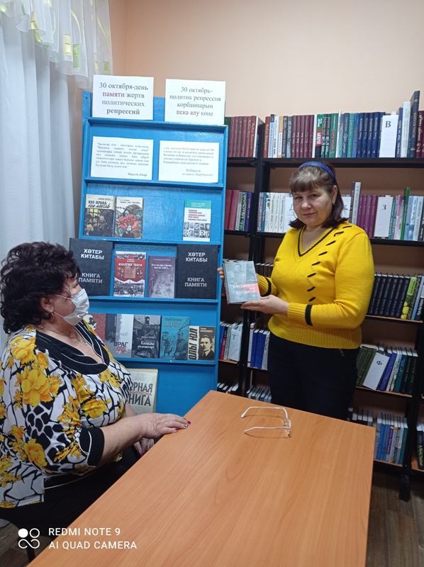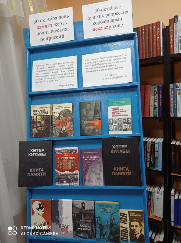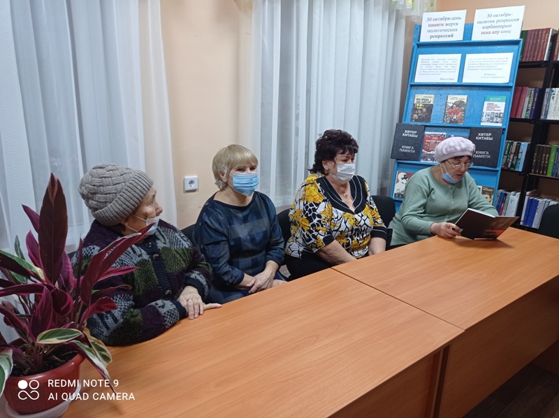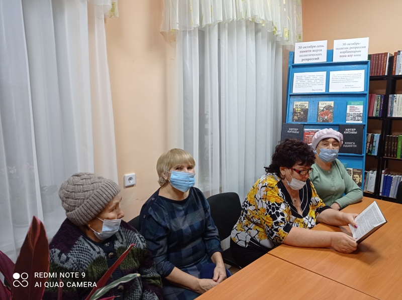 Китапаханәче Сафина А. А. шул уңайдан оештырылган китап күргәзмәсе белән таныштырып, татар әдәбиятындагы күренекле шәхесләр арасында да репрессия корбаннары булган әдипләрнең исемнәрен атады. Үзләре дә шул үлем лагерьларын кичкән әдипләр: Гурий Тавлин, Ибраһим Салаховларның шунда күргәннәре турында язган китапларыннан өзекләр, Рафаэл Мостафинның “Репрессияләнгән татар әдипләре” китабыннан Хәсән Туфан, Фатих Кәрим, Фәтхи Бурнаш, Галимҗан Ибраһимов турындагы җан тетрәндергеч өзекләрне укыдылар.