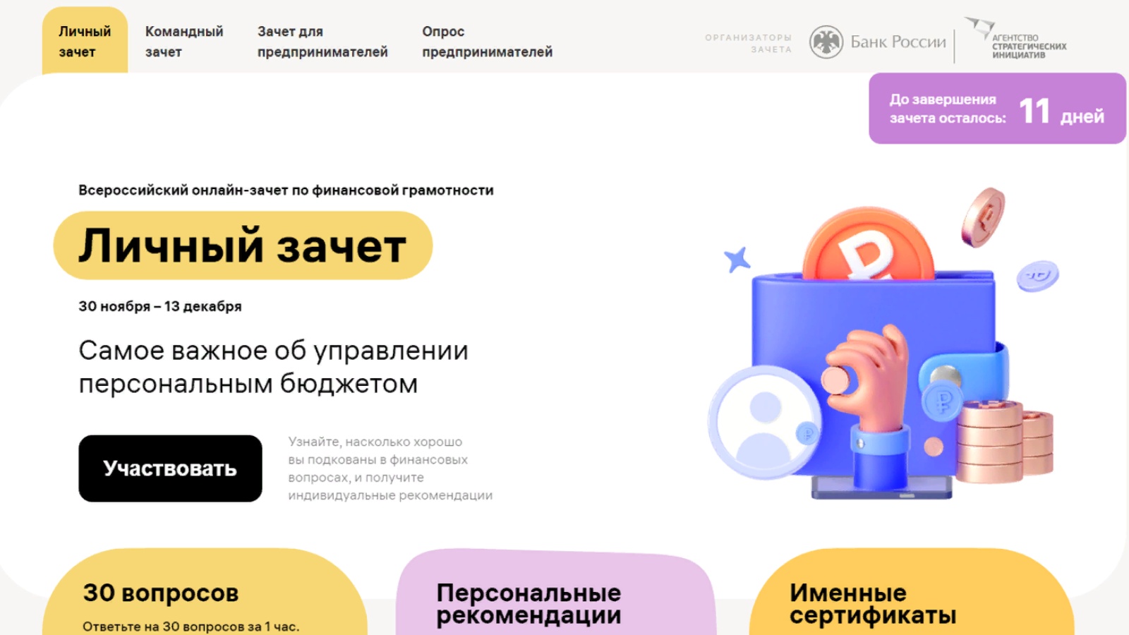 Теләге булган һәр кеше аның финанс мәсьәләләрендә ни дәрәҗәдә яхшы ориентлашуын тикшерә һәм шәхси киңәшләр ала алачак. Быел беренче тапкыр шәхси зачетта катнашырга һәм сорауларга мөстәкыйль рәвештә җавап бирергә генә түгел, дуслар яки хезмәттәшләрне җыярга да, команда ярышларында көчне сынап карарга да була.