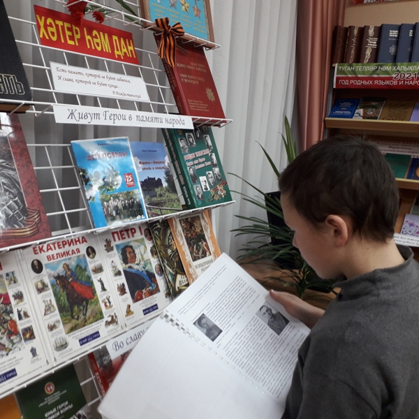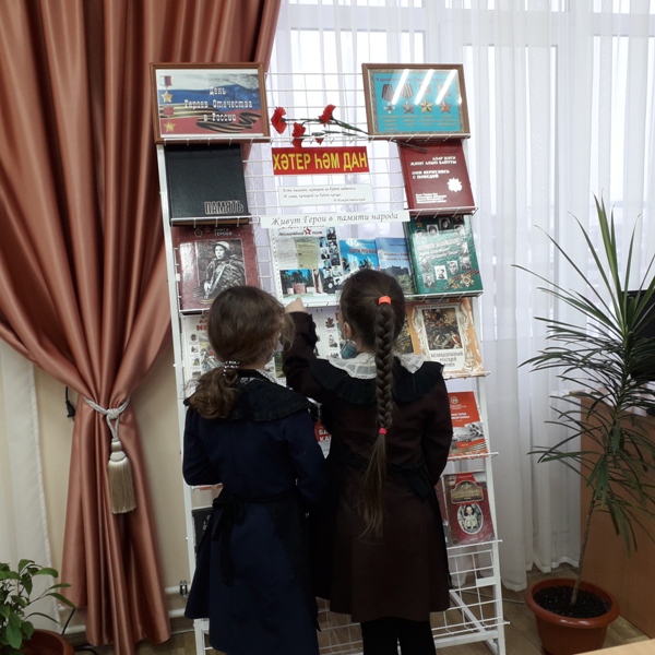 Балалар “Иске Гришкин: Үлемсез полк”, “Дети – Герои Великой Отечественной войны” китаплары аша мәгълүмат алып, туган илебезне каһарманнарча саклаган батырлар турында зур горурлык хисе белән искә алдылар.