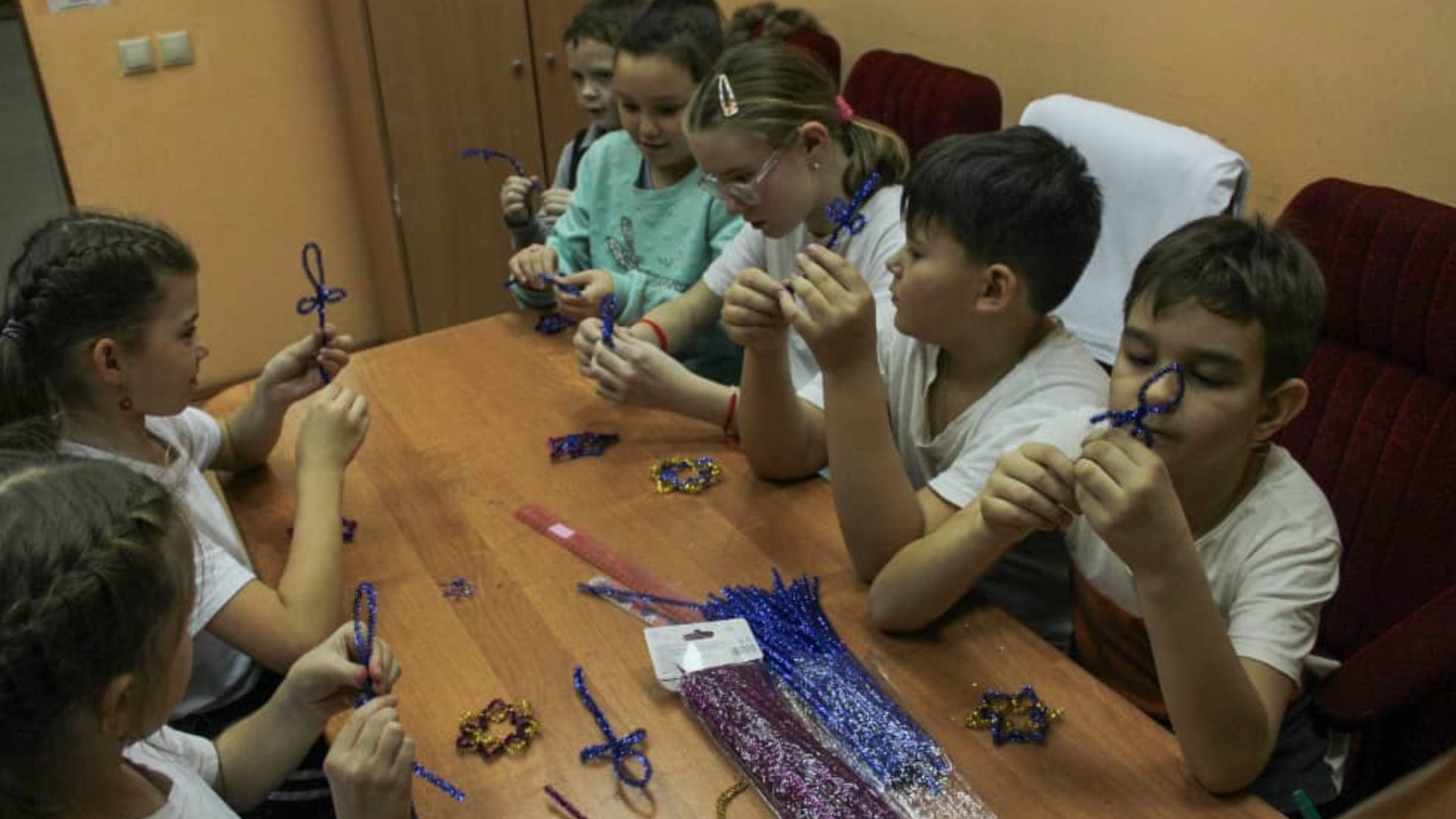 Синель чыбыгын иҗат өчен материал сыйфатында кулланып, балалар гадәти булмаган, үзенчәлекле, матур кар бөртекләре ясадылар.