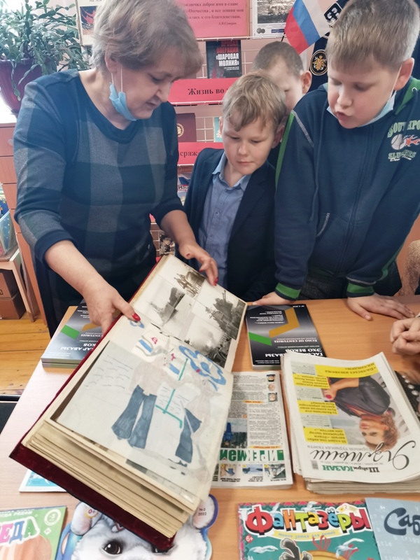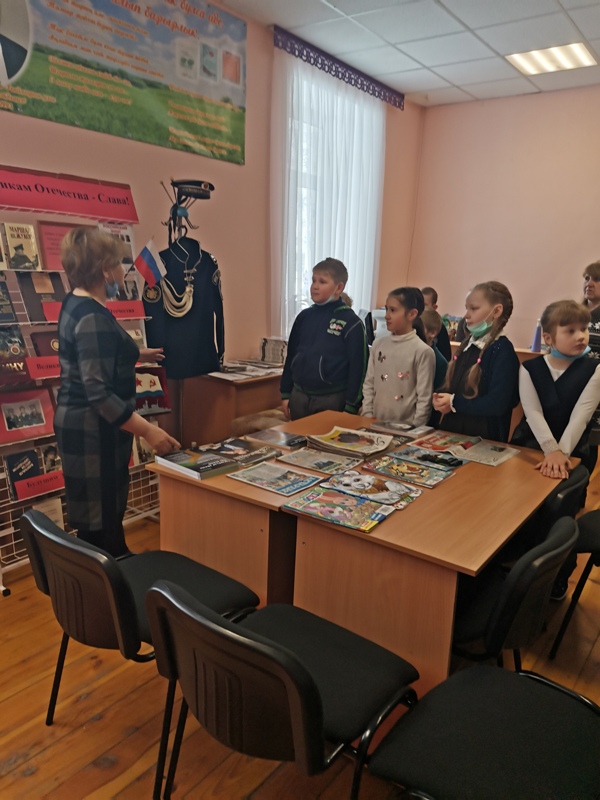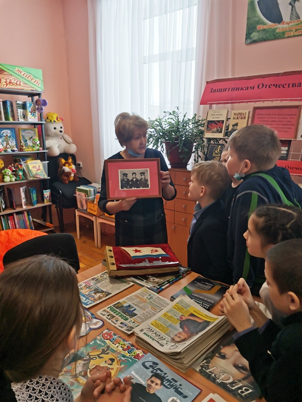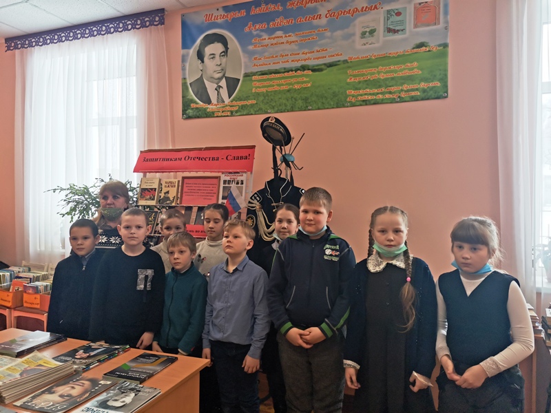 Балаларны, яшьләрне патриотик рухта әхлакый тәрбияләү бүгенге көннең мөһим проблемаларының берсе булуын истә тотып күргәзмәгә күзәтү үткәрелде. Китапханәче Ф.Бәшәрова китаплар аша бу бәйрәмнең әһәмияте, данлы Совет армиясенең үткәне, Бөек Ватан сугышында Җиңүгә бәяләп бетергесез өлеш керткән маршал Жуков, патриот-шагыйрь М.Җәлил,көнне төнгә ялгап эшләгән тыл хезмәтчәннәре турында сөйләде. Кече һәм урта яшьтәге балаларга патриотик рухтагы әдәбият укырга тәкъдим итте. Күргәзмәдә урын алган, авылдашыбыз, Балтыйк хәрби-диңгез флотында хезмәт иткән Х.Башаровның дембель альбомы да укучыларда кызыксыну уятты.