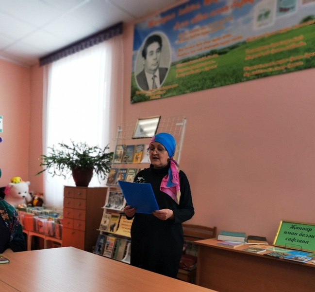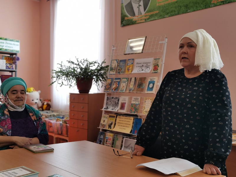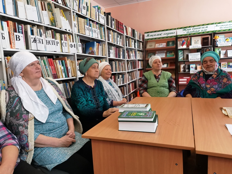 “Калебләрдә дәвам итсен Рамазан шәриф ае” дип исемләнгән фикер алышу сәгатенә “Мөхәммәдия” мәдрәсәсе тәмамлаган авылдашыбыз Сания Мөнәвир кызы Шәймөхәмәтова чакырулы иде. Рамазан - барлык гөнаһлардан пакьлану, күңелләрне сафландыру, күркәм сыйфатлар белән бизәкләү ае. С. Шәймөхәмәтова барлык айлар арасында иң күркәм ай булган Рамазан ае, көннәр арасында иң олысы булган җомга көне фазыйләтләре, ният кылу, сәдака бирү тәртипләре белән таныштырды, өлкәннәрне кызыксындырган сорауларга җавап бирде. Китапханәче Ф. Бәшәрова “Җаннар иман белән сафлана” дигән китап киштәсендәге дини әдәбиятка күзәтү үткәрде. Соңыннан сөйләшү түгәрәк өстәл артында дәвам итте.