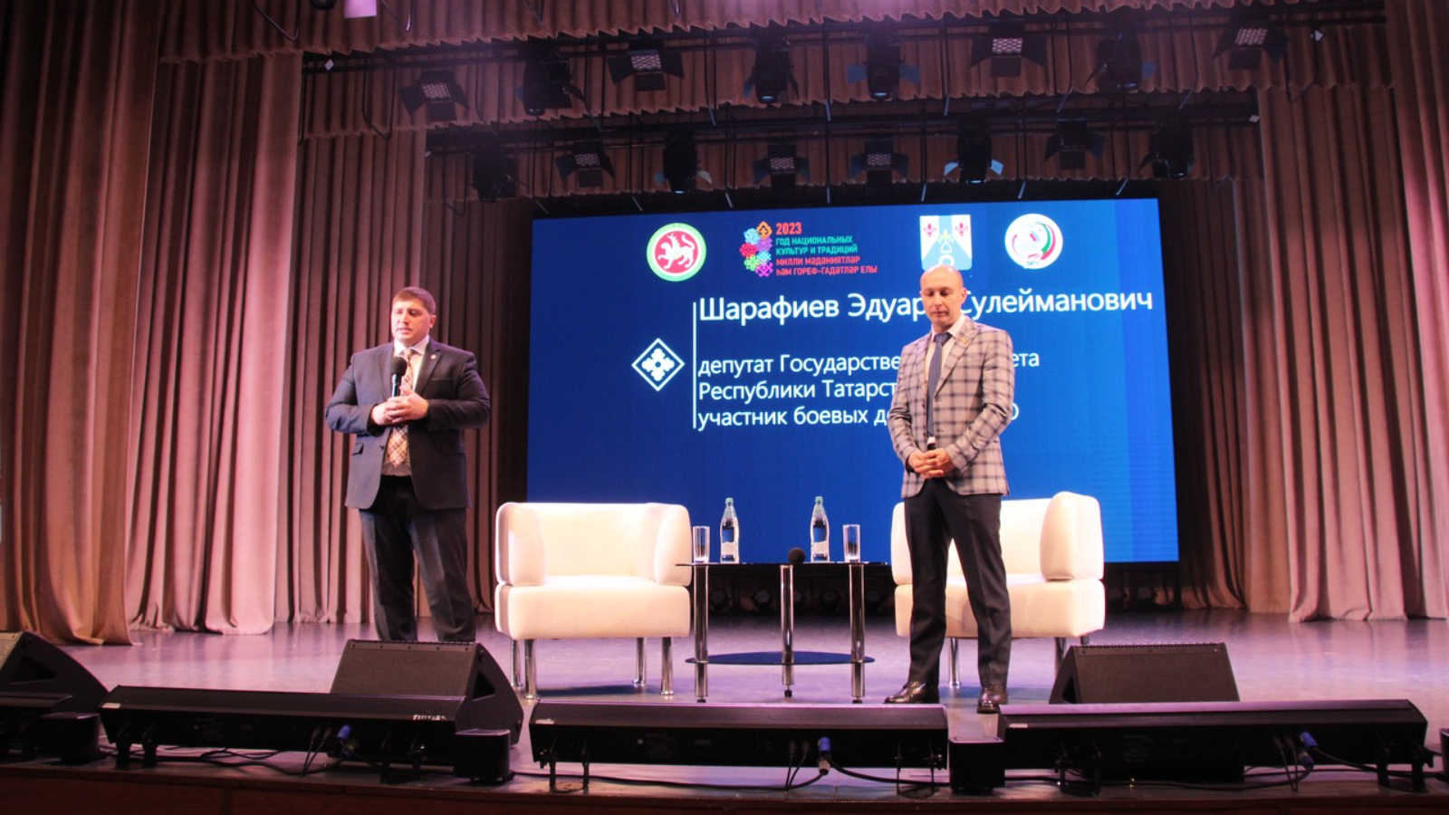 Дәүләт Советы депутаты шулай ук балаларны хәзер интернетта һәм социаль челтәрләрдә барган мәгълүмати сугышка бирелмәскә, мәгълүмати кырда булган мәгълүматка тәнкыйть белән карарга чакырды. Очрашуның модераторы булып Менделеевск районы башлыгы Радмир Беляев чыгыш ясады. Аның инициативасы буенча Эдуард Шәрәфиев белән очрашуга сугышчыларның балаларын чакырдылар.
