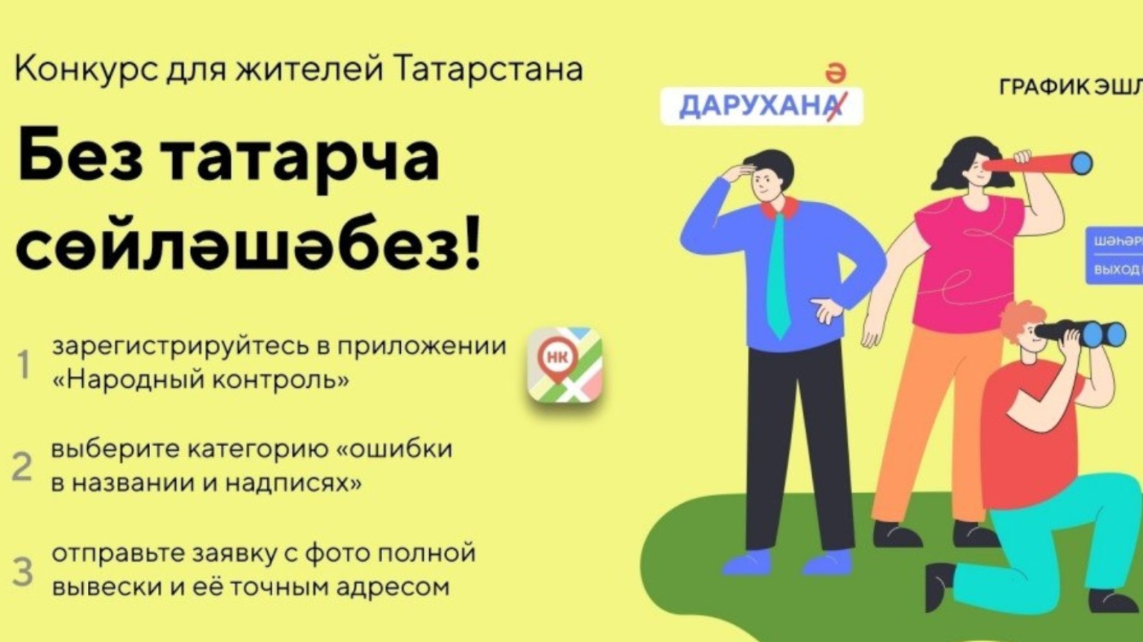 Конкурс 1 ноябрьгә кадәр дәвам итәчәк. «Халык контроле» мобиль кушымтасында яки ТР Дәүләт хезмәтләре порталында «Халык контроле» бүлегендә катнашырга мөмкин. Гариза бирү өчен «Исемнәрдә һәм язуларда хаталар» категориясен сайларга, фото яки видеоны беркетергә, контакт мәгълүматларын күрсәтергә кирәк.