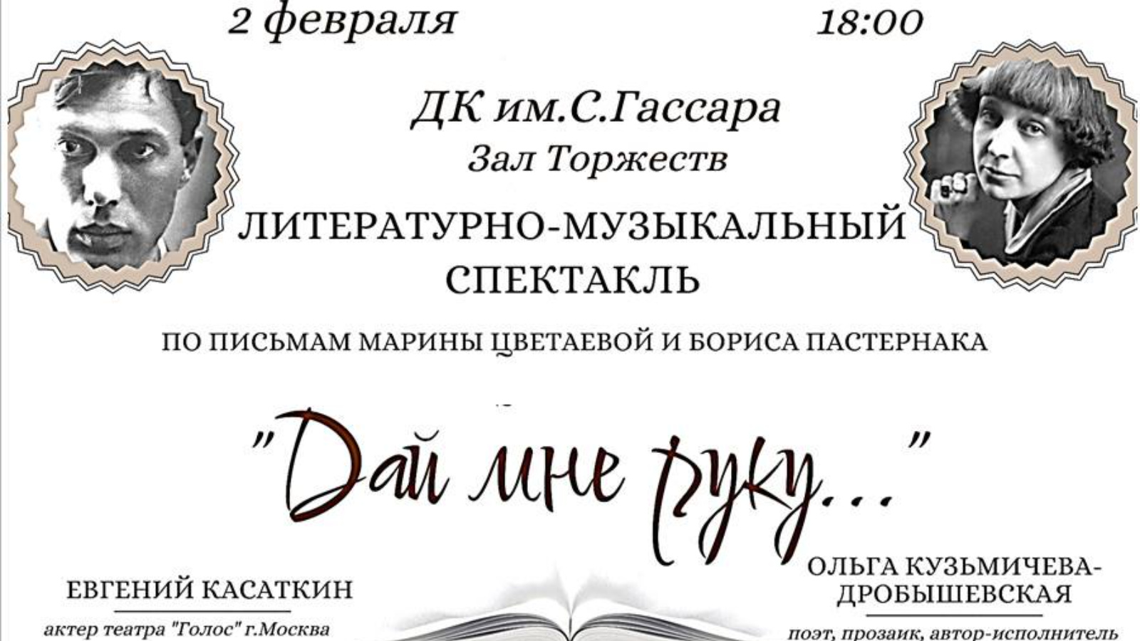 Борис Пастернакның туган көненә багышланган «Бир кулыңны...» әдәби-музыкаль спектакле 2 февральдә 18.00 сәгатьтә Сергей Гассар исемендәге мәдәният сараеның тантаналар залында узачак. Билет бәясе 350 сум! Барыгызны да чакырабыз!