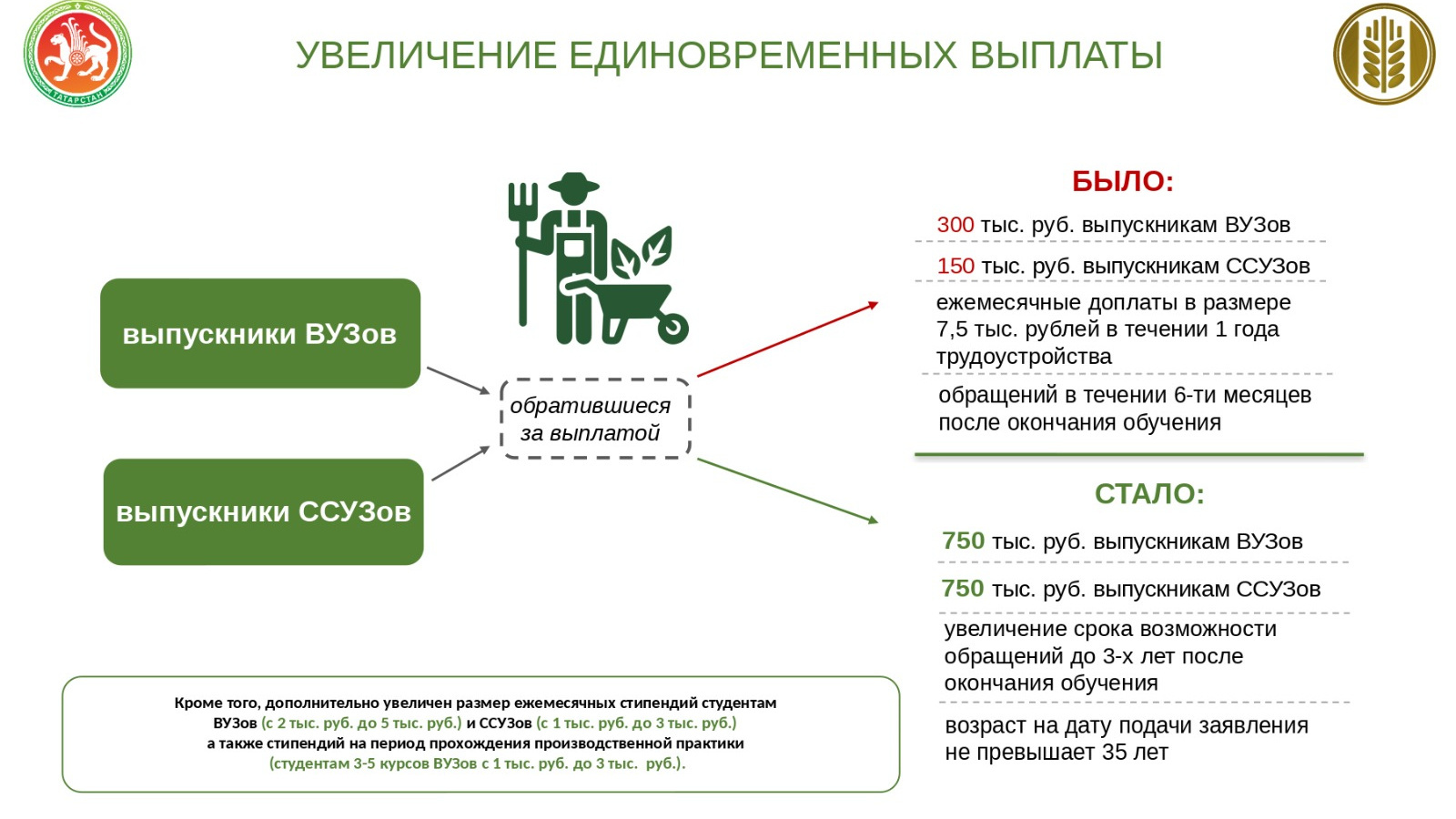 Яшь кадрларны республиканың агросәнәгать комплексына җәлеп итү һәм анда калдыру максатларында Татарстан Республикасы Рәисе Р.Н.Миңнеханов Татарстан Республикасы Авыл хуҗалыгы һәм азык-төлек министрлыгының авыл хуҗалыгында эшләүче яшь белгечләргә түләүләрне арттыру турындагы инициативасын хуплады. Татарстанда алар өчен бер тапкыр бирелә торган түләү 2,5 тапкырга арта һәм 750 000 сум тәшкил итә. Бер мәртәбә түләүдән тыш, авыл хуҗалыгы белгечлеге буенча белем алучы студентлар өчен айлык стипендияләр дә арттырылды. Югары уку йортлары студентлары 2 000 урынына 5 000 сум алачак, ә урта махсус уку йортлары студентлары 1 000 урынына 3 000 сум алачак.