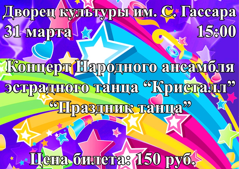 31 март 15.00 сәгатьтә С. Гассара ис. мәдәният сараеда "Кристалл" халык бию ансамбленең " Праздник танца " концертына чакыра . Билет бәясе 150 сум. Барлык теләүчеләрне көтеп калабыз.